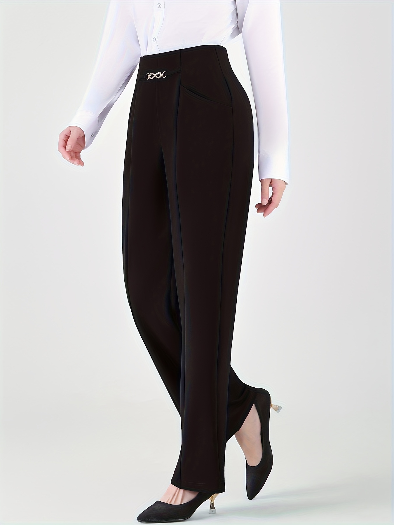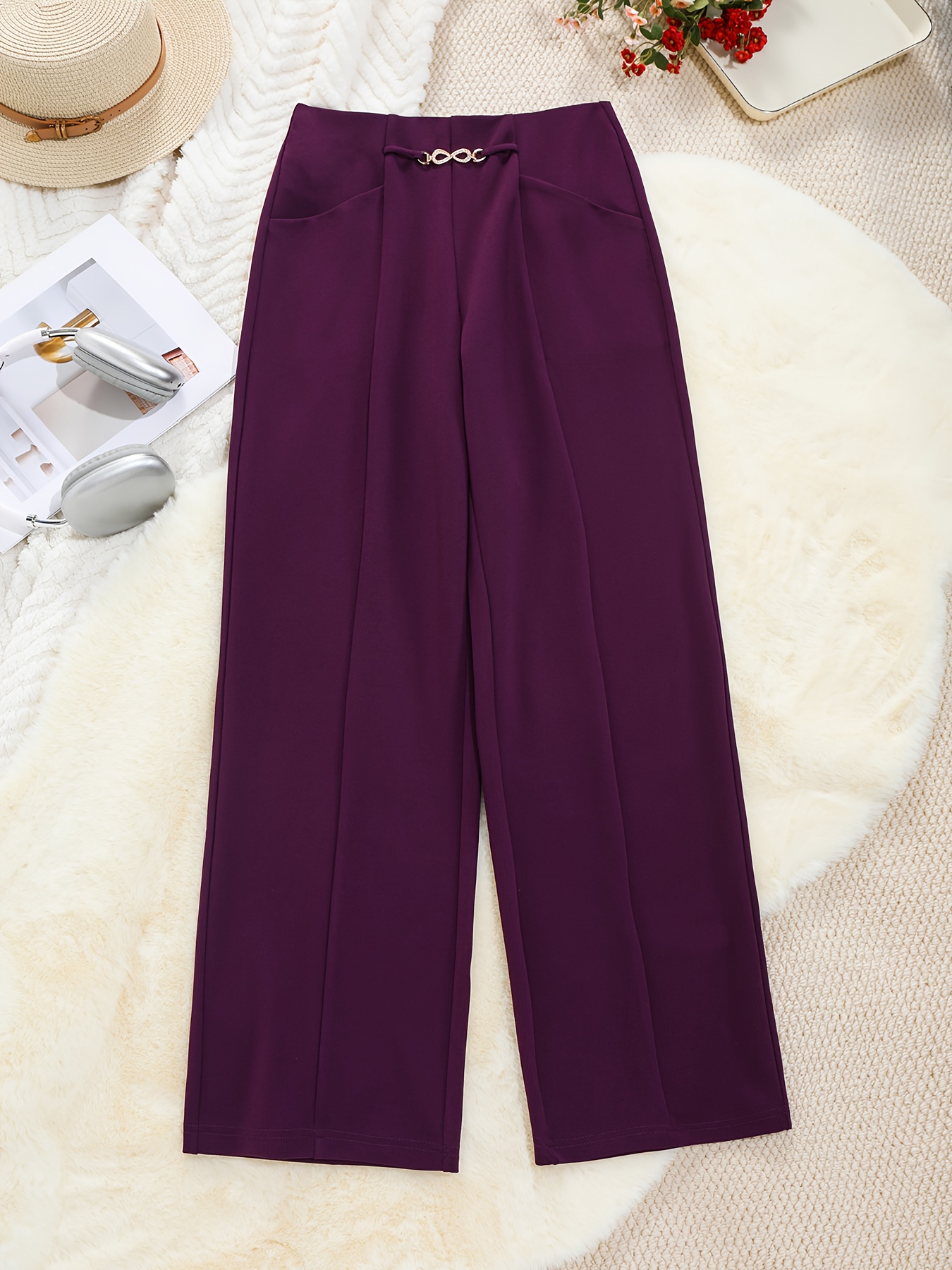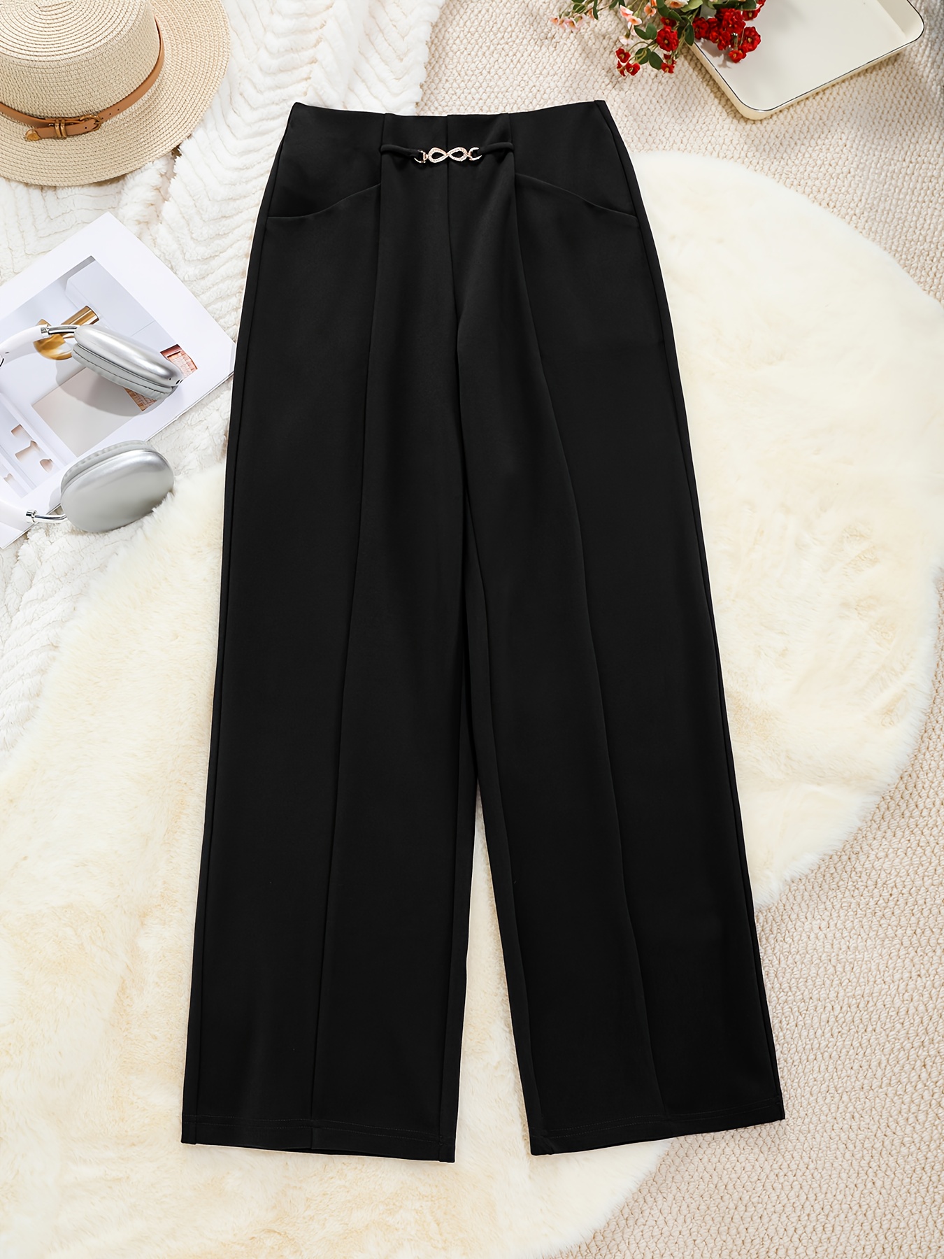 Elegant Women’S High Waist Wide Leg Pants | Metal Chain Detail, Elastic Waist, Pockets, Long Length, Solid Color, Suitable for Casual and Office Wear
