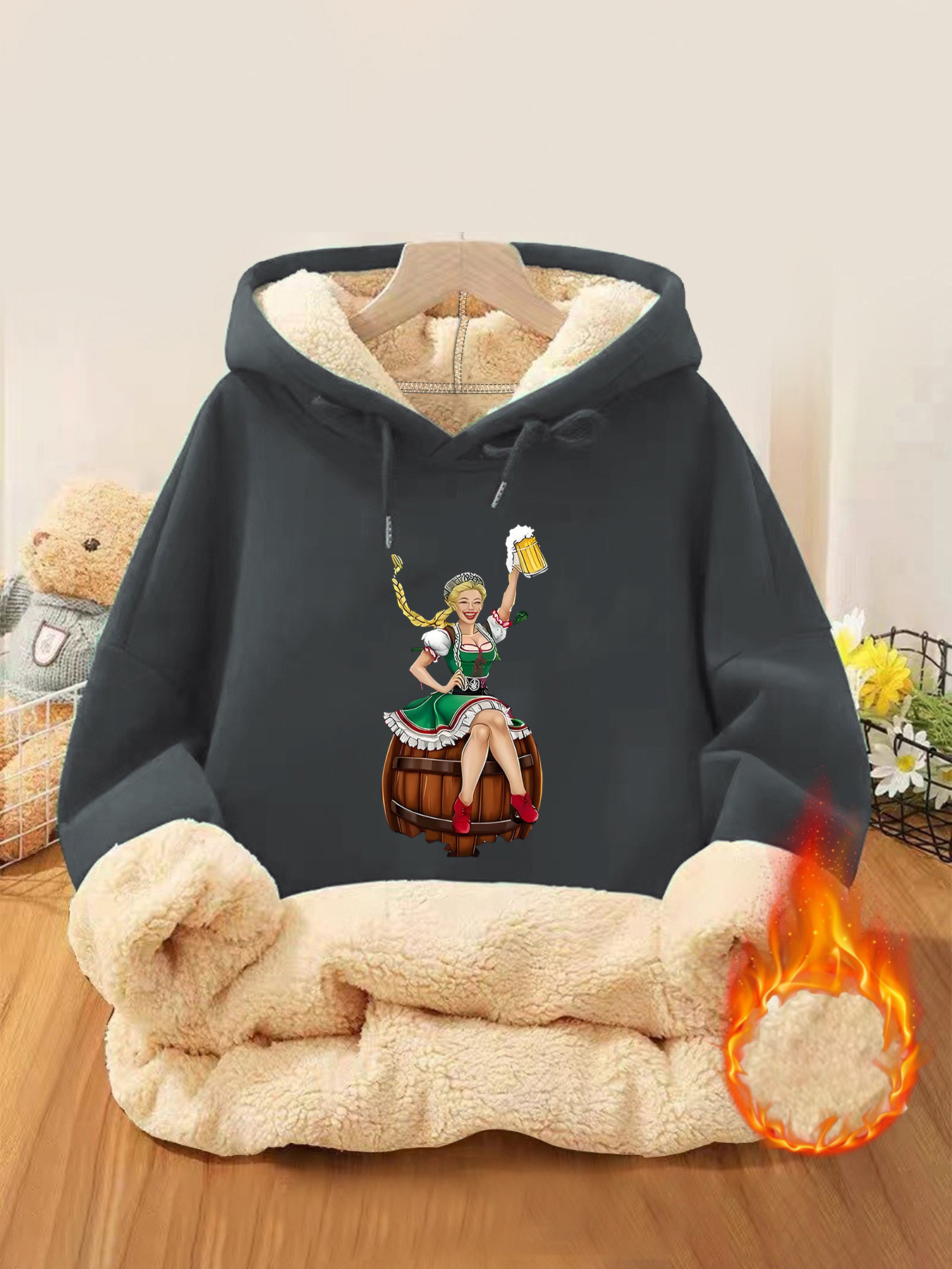 Oktoberfest Hoodie – German Beer Festival Pullover with Bavarian Woman Print, Thickened Winter Sweatshirt for Beer Festival Parties