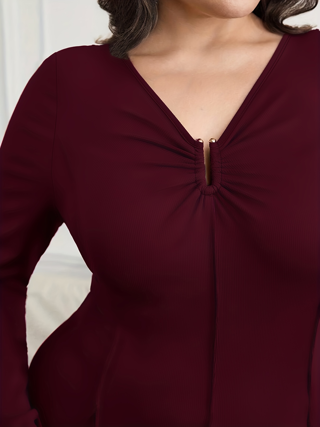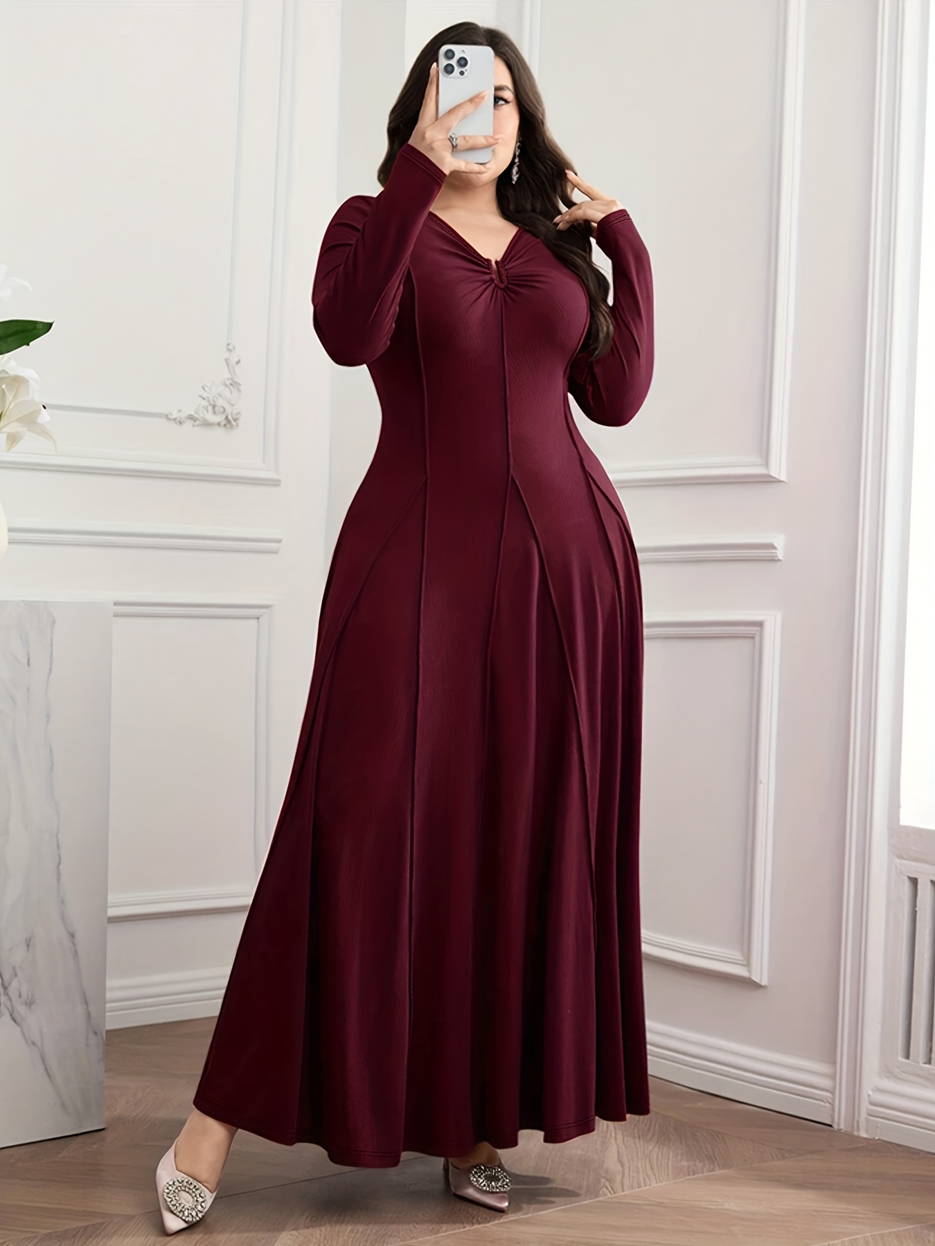 Plus Size – Plus Size – Plus Size – Plus Size – Plus Size – Elegant Plus Size V-Neck Long Sleeve A-Line Maxi Dress with U-Shaped Neckline & Waist-Cinching Belt – Solid Color, Medium Stretch, Perfect For Parties, Shopping, And Casual Attire