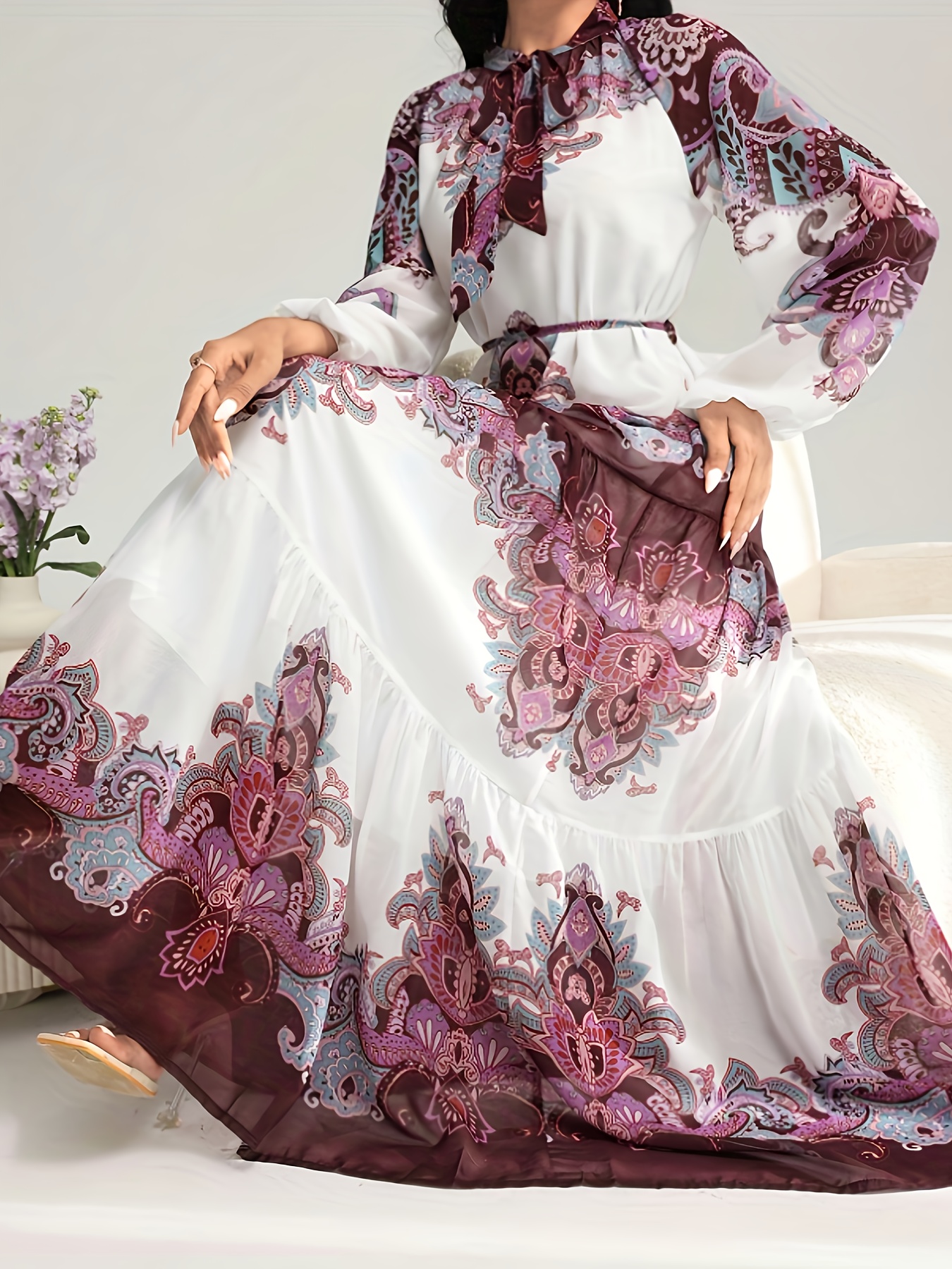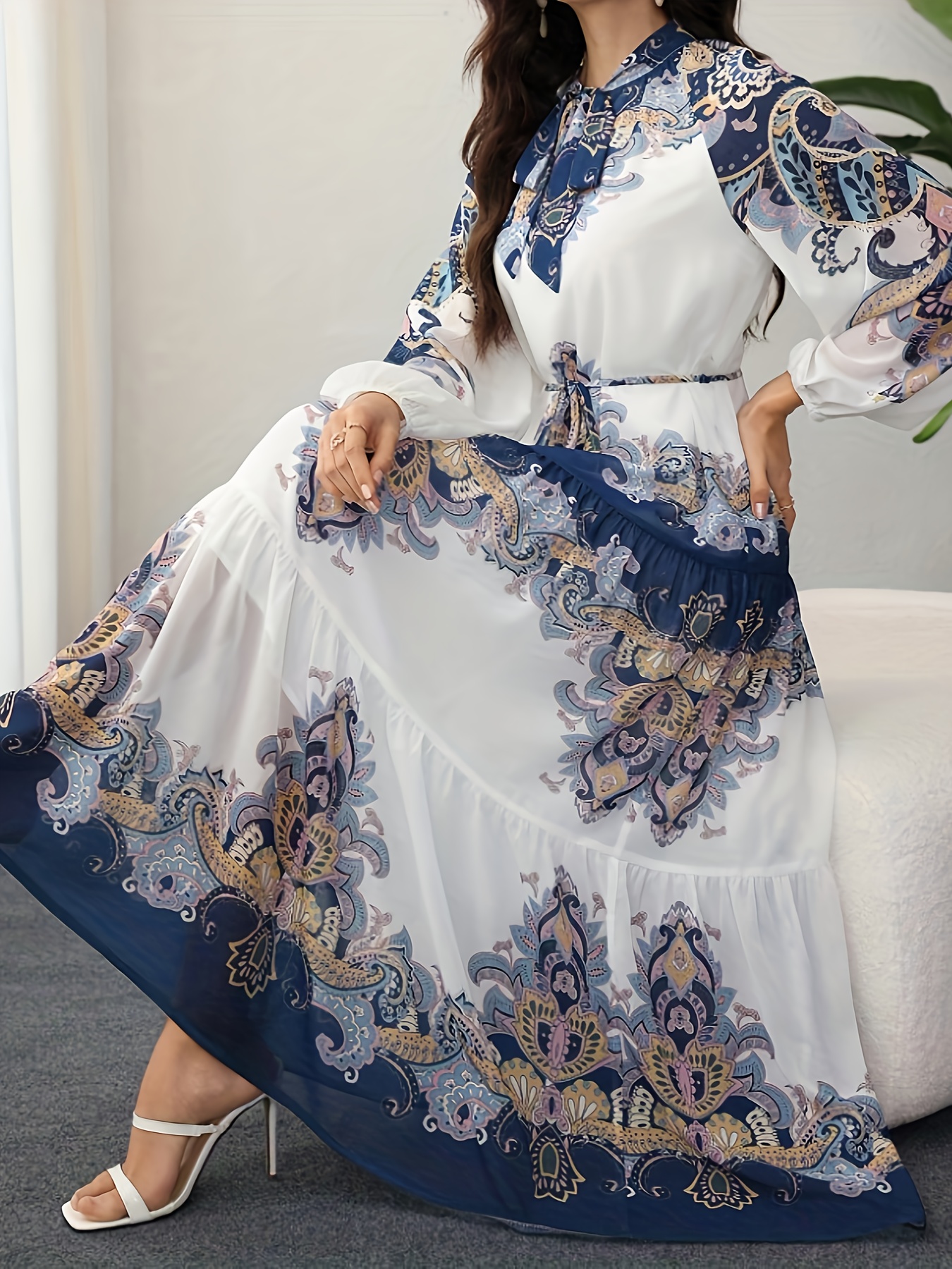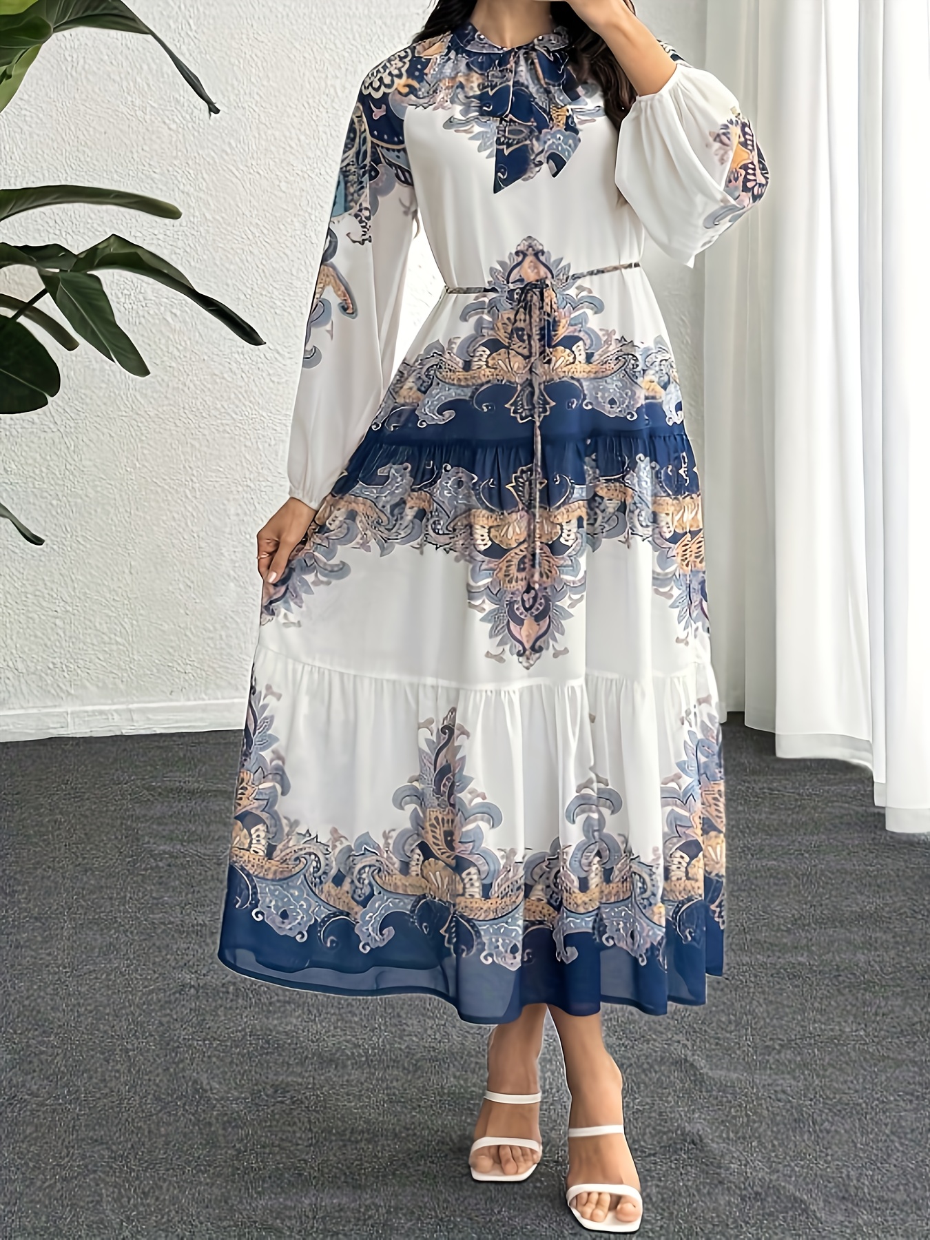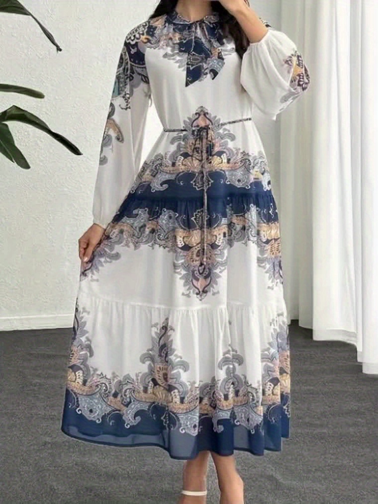 素晴らしい Plus Size, Spring-Summer Positioning Print Tie Bow V Neck Lantern Sleeve Waist-Cinching Women’s Dress with Ruffle Hem, Belted for Holidays and Casual Wear