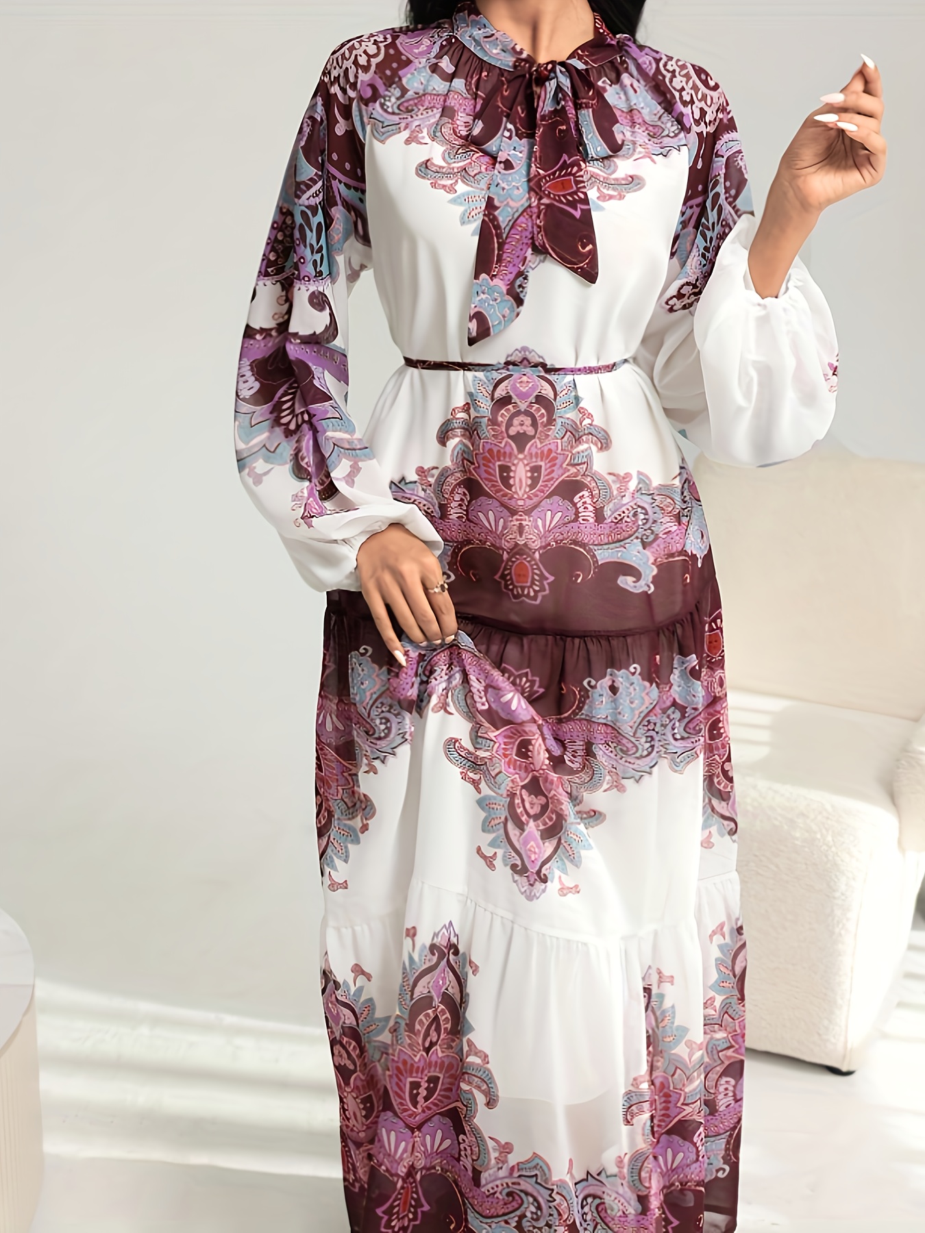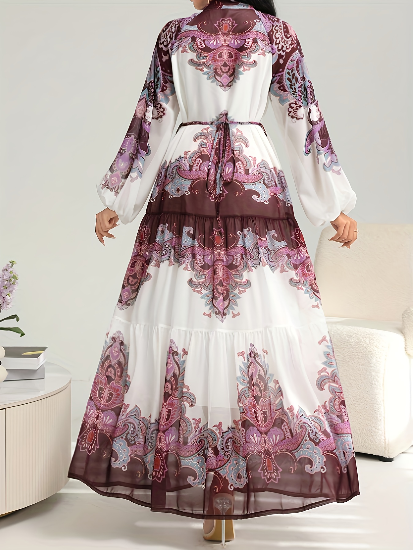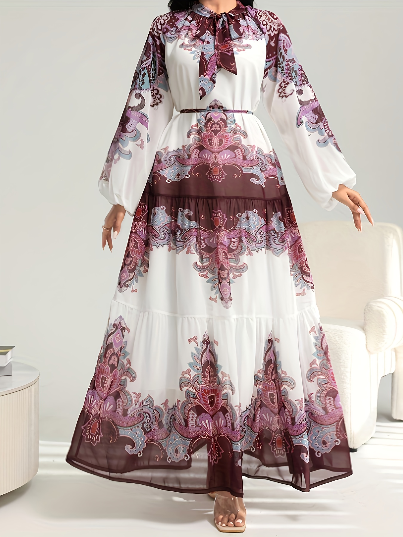 素晴らしい Plus Size, Spring-Summer Positioning Print Tie Bow V Neck Lantern Sleeve Waist-Cinching Women’s Dress with Ruffle Hem, Belted for Holidays and Casual Wear