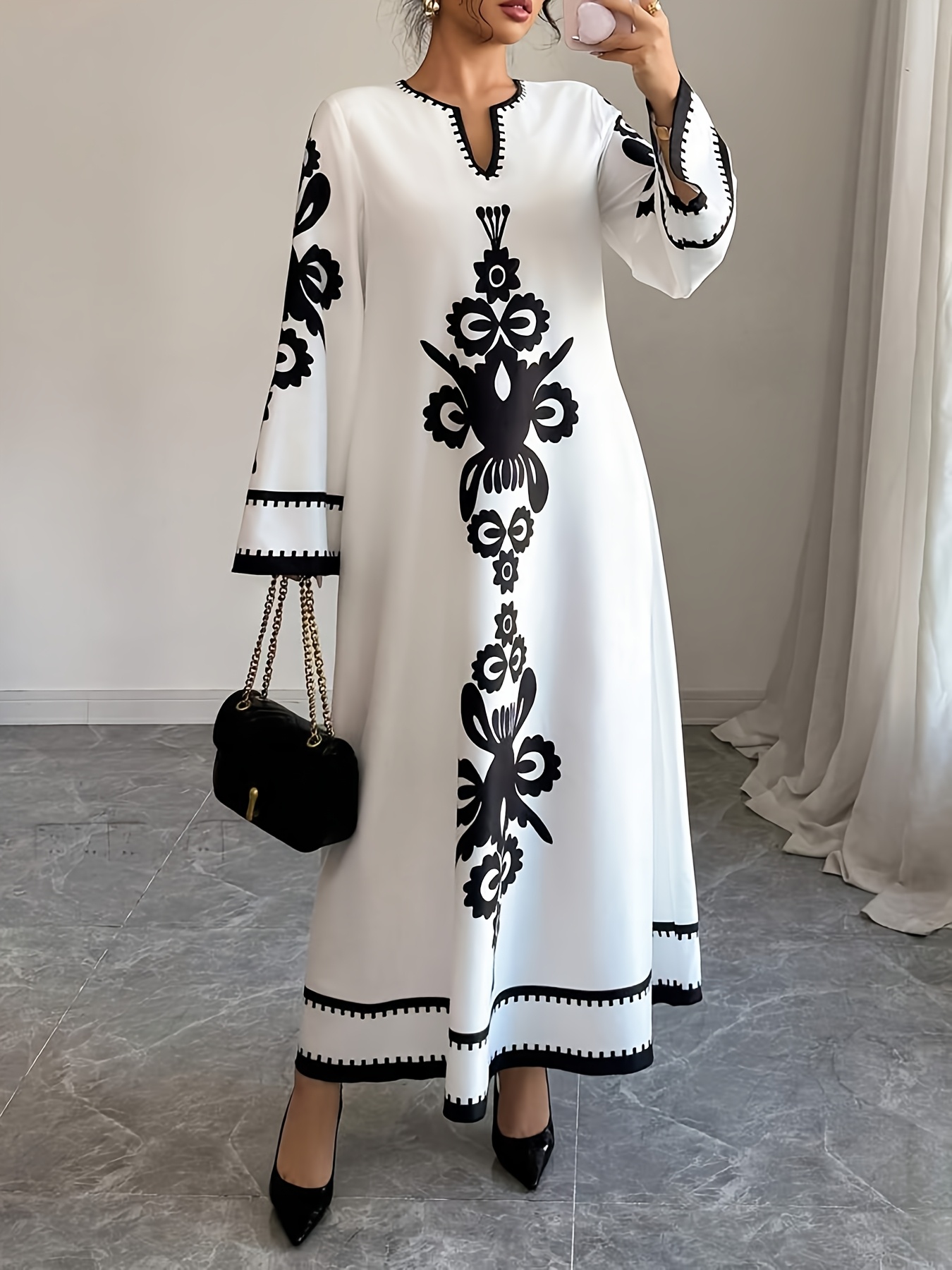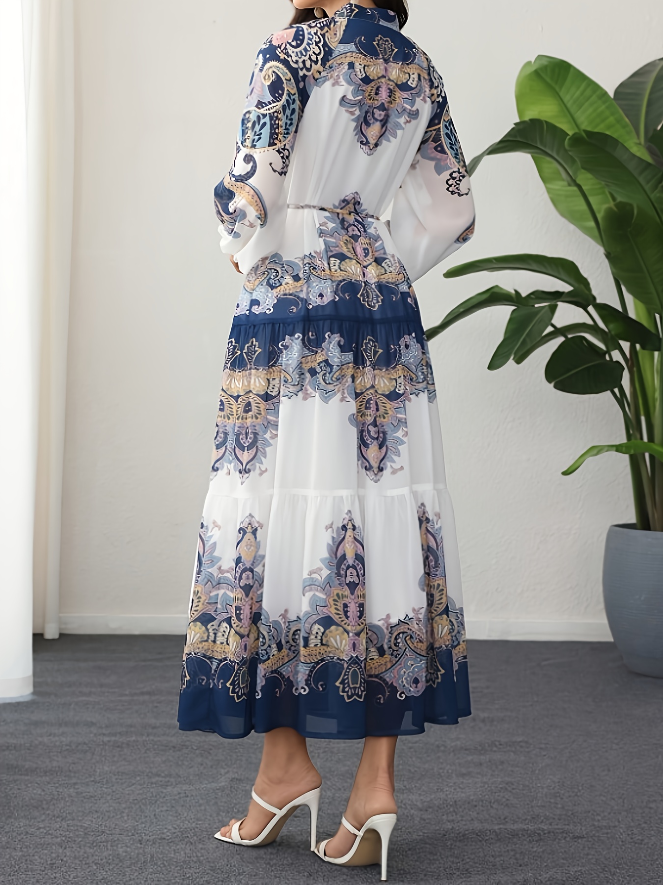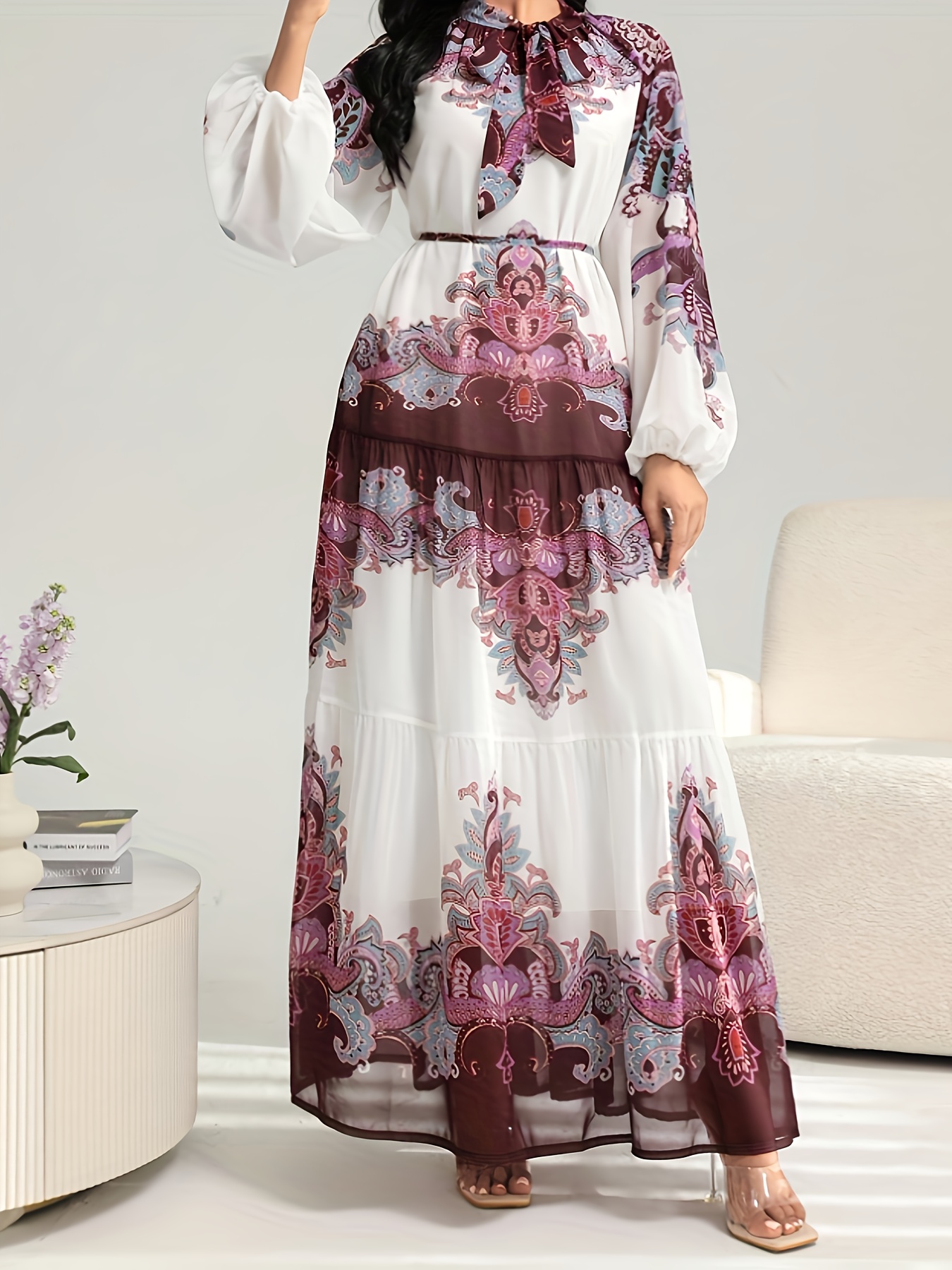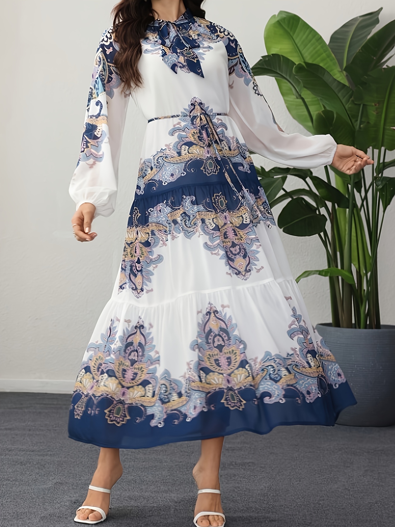 素晴らしい Plus Size, Spring-Summer Positioning Print Tie Bow V Neck Lantern Sleeve Waist-Cinching Women’s Dress with Ruffle Hem, Belted for Holidays and Casual Wear