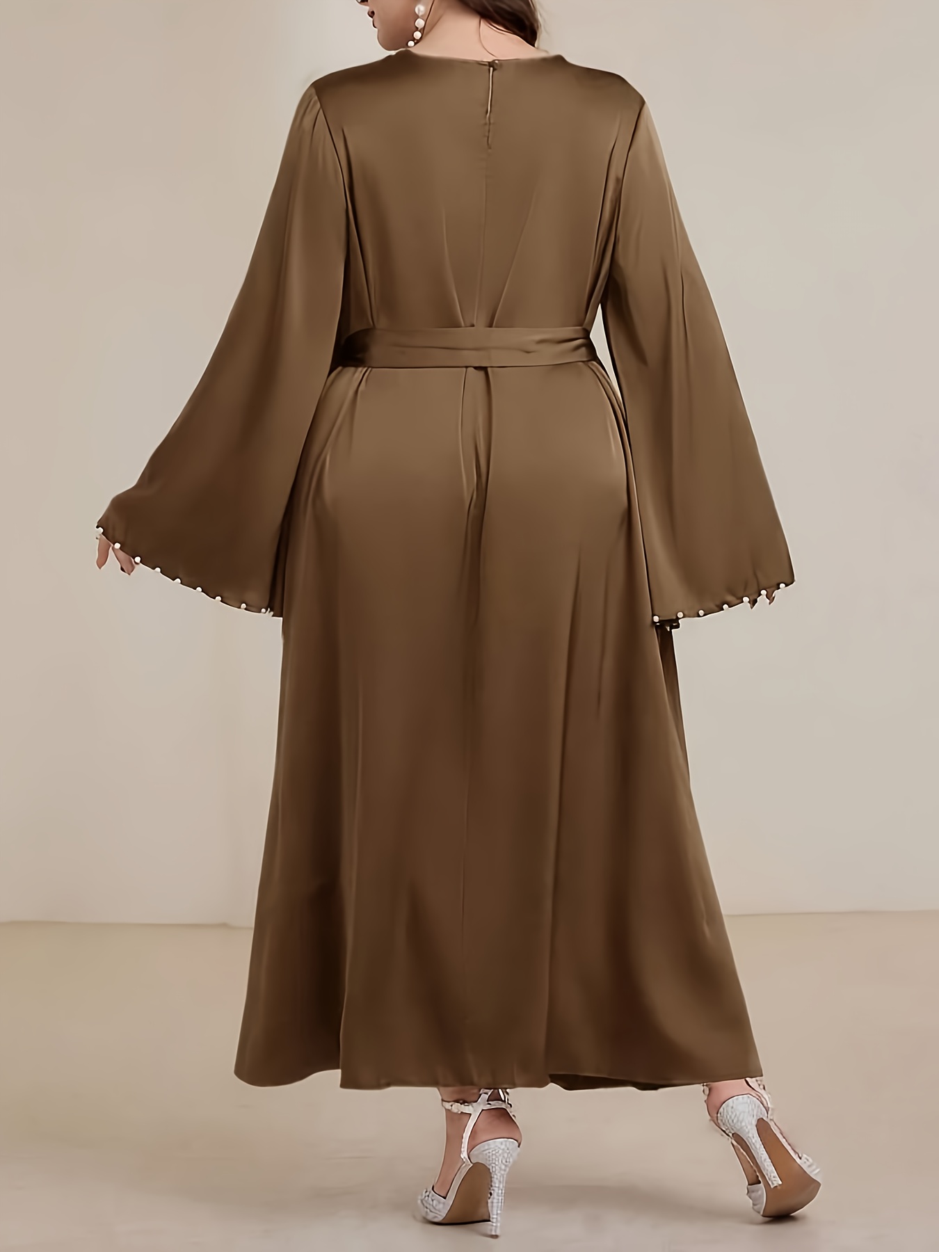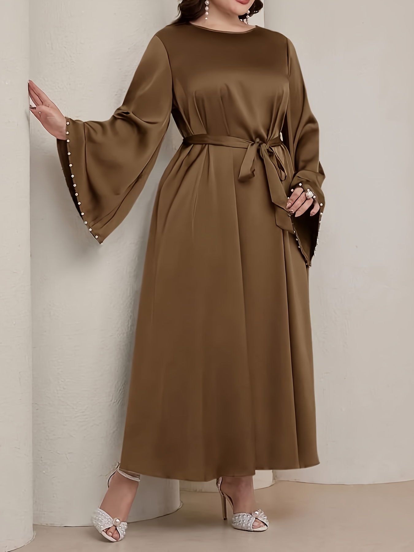 Plus Size, Women’s Elegant Plus Size Long Sleeve A-Line Maxi Dress with Pearl-Adorned Puffed Sleeves & Belted Waist – Floor-Length Formal Evening Gown for Weddings, Prom, Galas – Machine Washable All-Season Tuxedo Dress – Round Neck Solid Color Non-Stretch Fabric with Pearl Detailing and Belt for Sophisticated Look – Fitted Bodice and Flowing for Graceful Silhouette