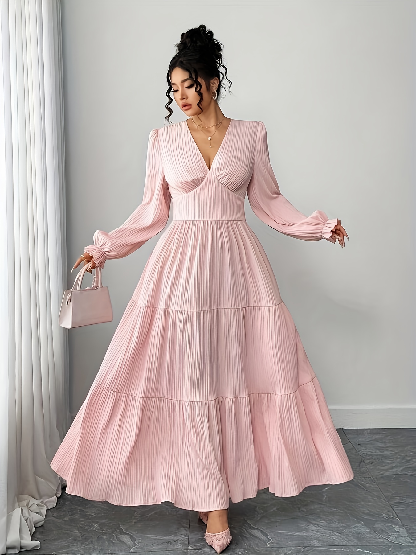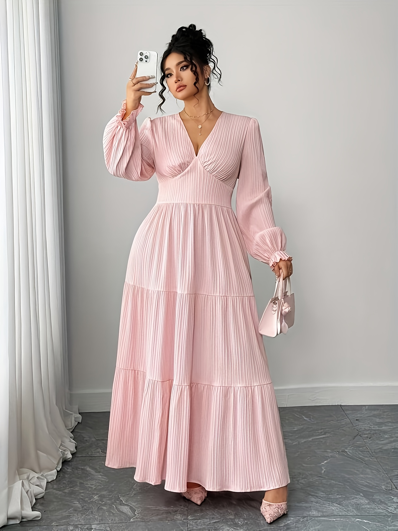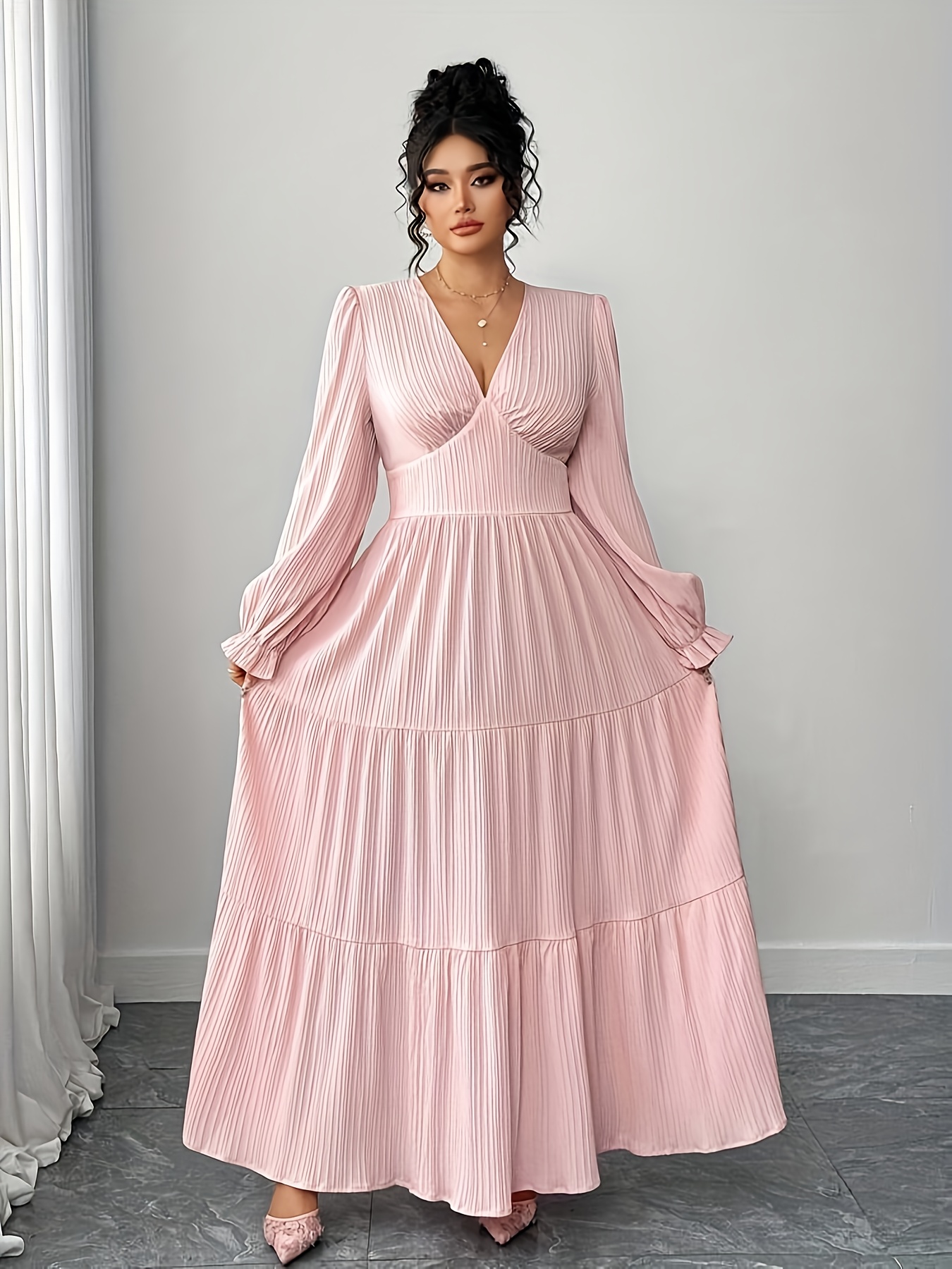 Plus Size V-Neck Maxi Dress A-Line Long Sleeve Wrinkle-Free