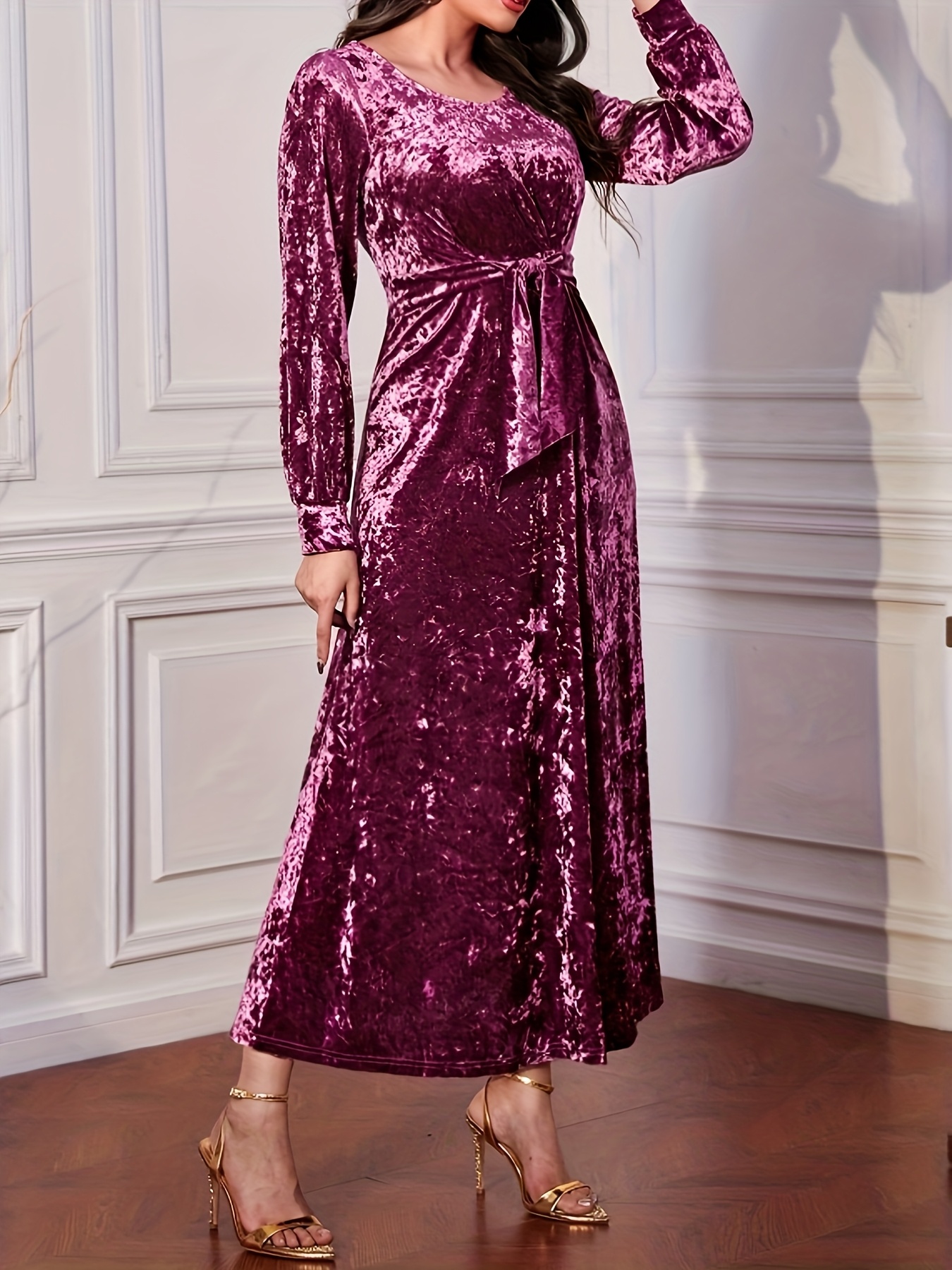 Plus Size, Women’s Elegant Winter Dress with Front Bow Tie – Fitted Long Sleeve A-Line Dress, Solid Color Round Neck, Machine Washable, Cozy Fall & Winter Outfits for Parties, Weddings, Church Events – Dress Length from Waist to (No Transparency