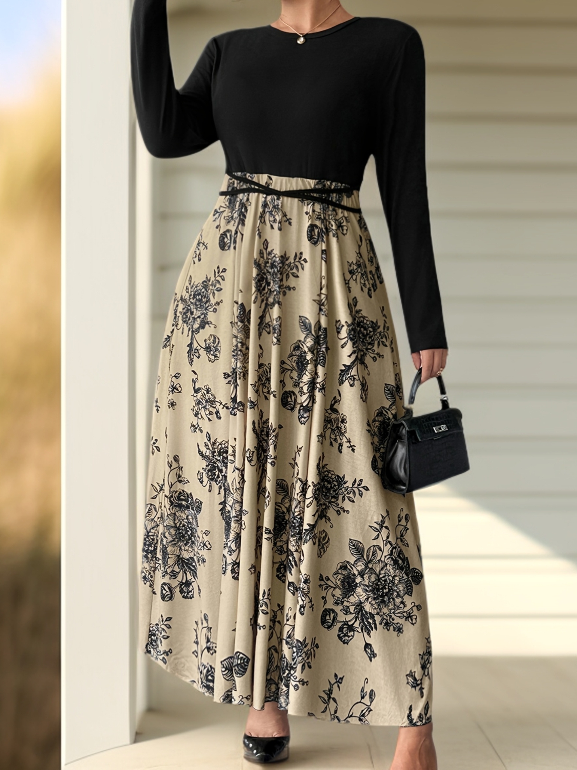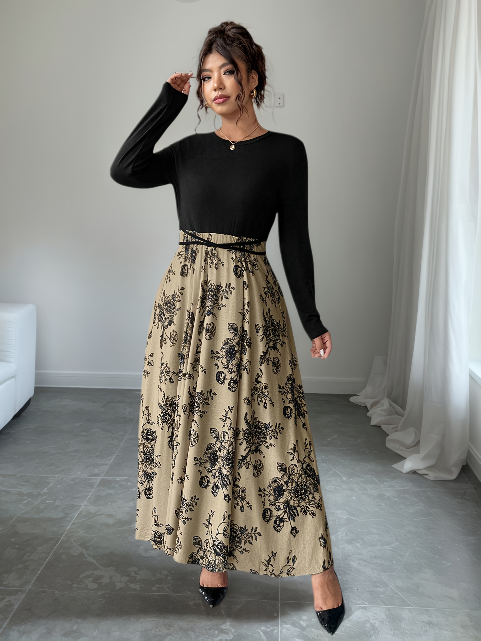 Plus Size, Women’s Floral print maxi dress – Beige & black Floral pattern, Tie-waist flared skirt, Machine Washable Formal & Casual Outfits for Fall/Winter Everyday Special Events, Winter Elegant Outfit, Nontransparent Material, Fall Fashion, Quality Stitching, Plus Size Women