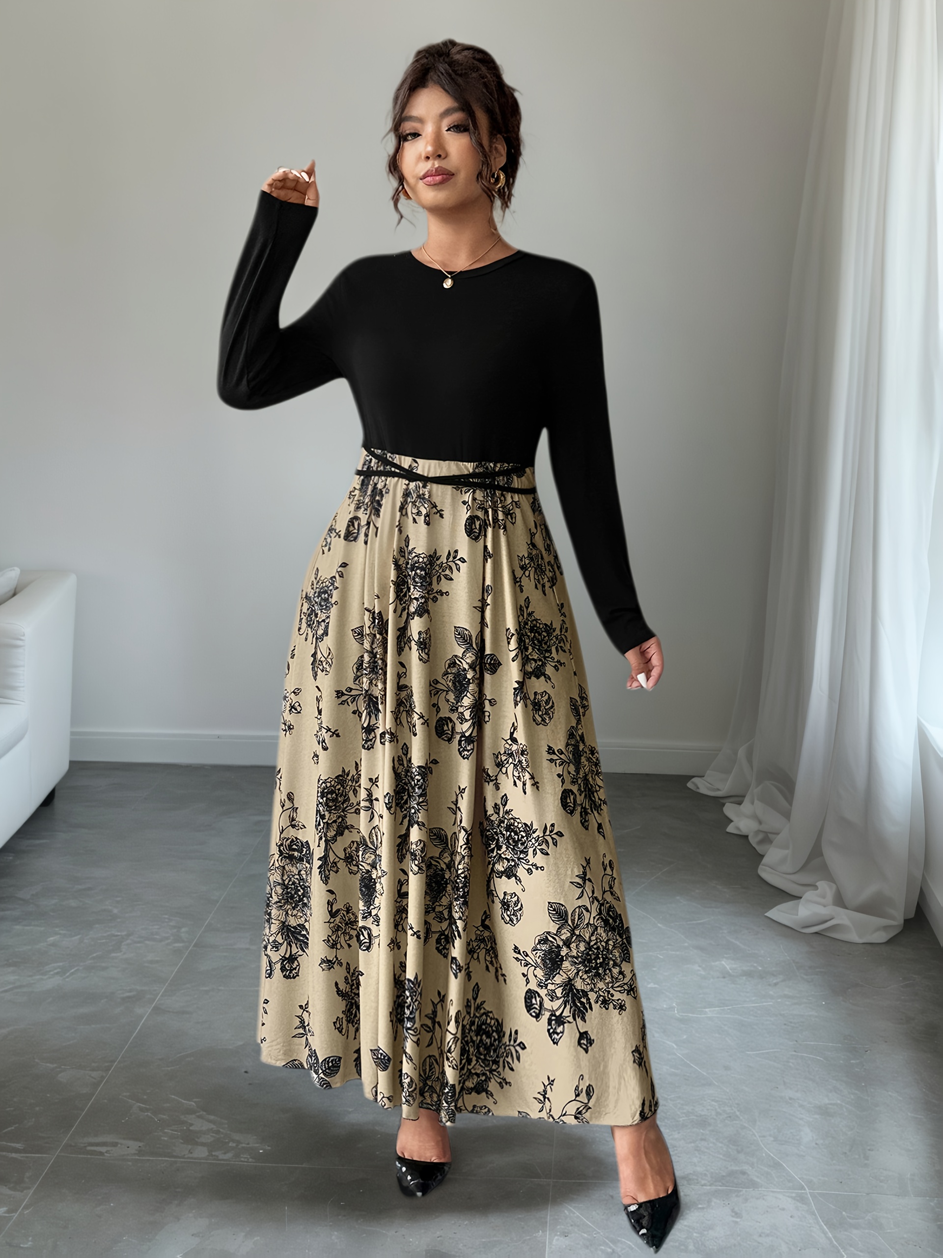 Plus Size, Women’s Floral print maxi dress – Beige & black Floral pattern, Tie-waist flared skirt, Machine Washable Formal & Casual Outfits for Fall/Winter Everyday Special Events, Winter Elegant Outfit, Nontransparent Material, Fall Fashion, Quality Stitching, Plus Size Women