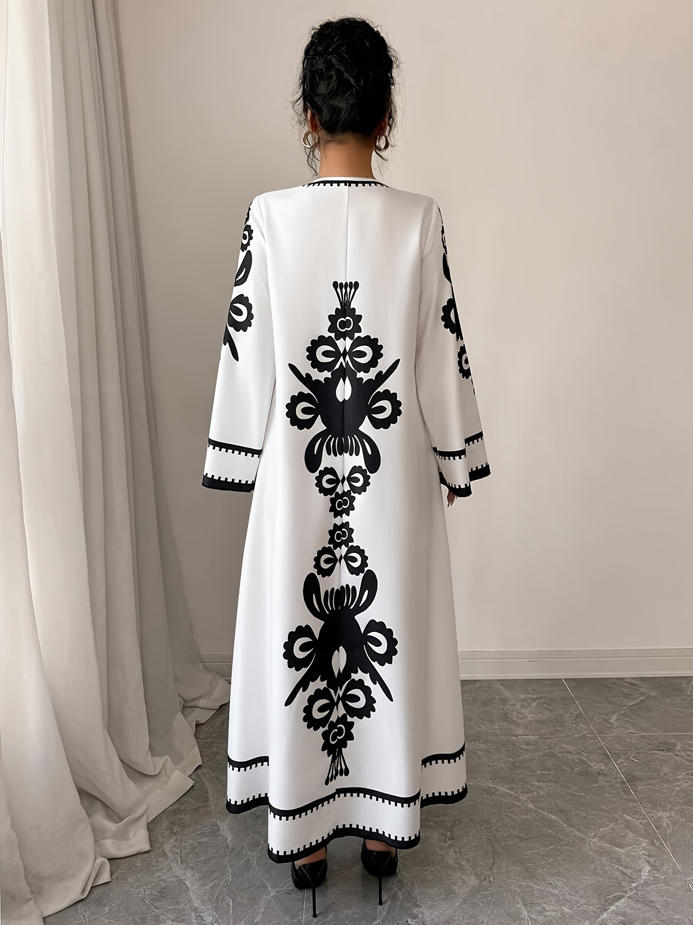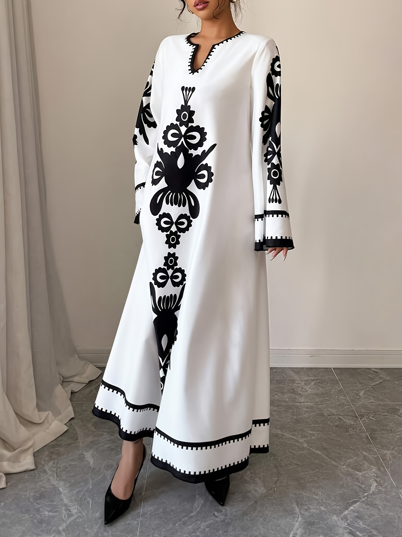 Plus Size – Women’S Plus Size V-Neck Long Sleeve Dress with Floral Print – Casual Loose Fit, Black & White Design, Perfect for Spring/Summer, Casual Summer Dress | Vneck Dress | Nonstretch Fabric