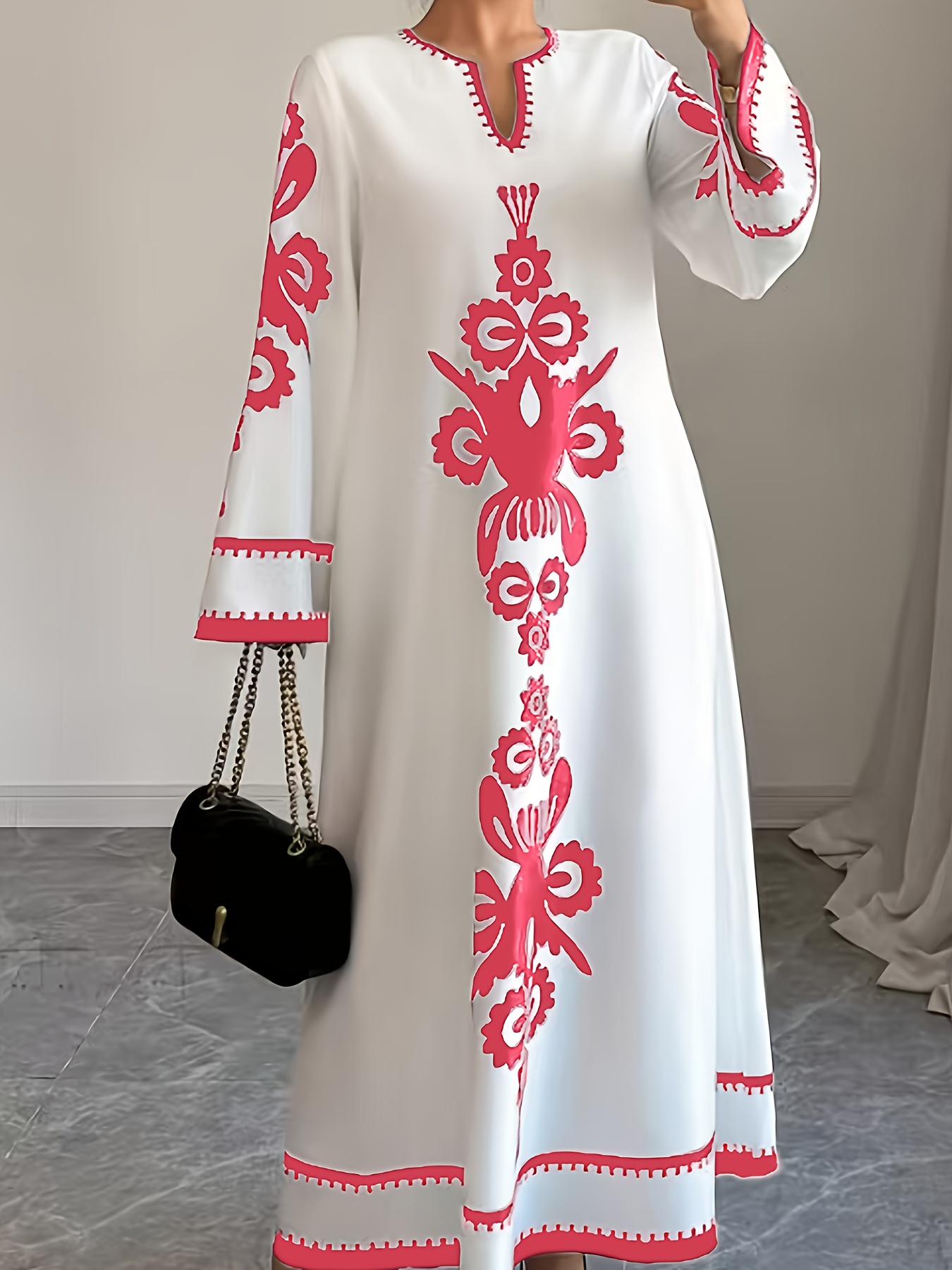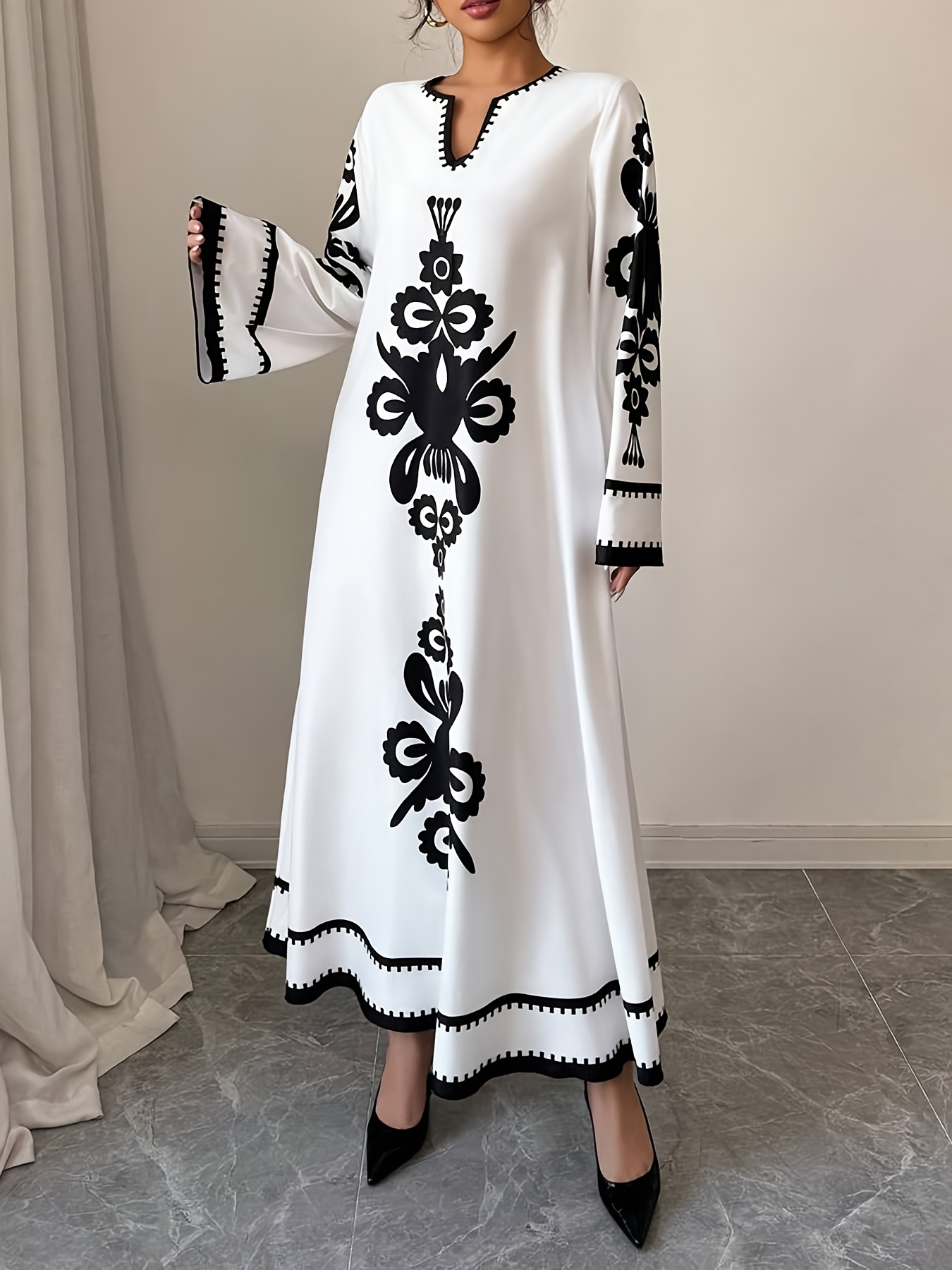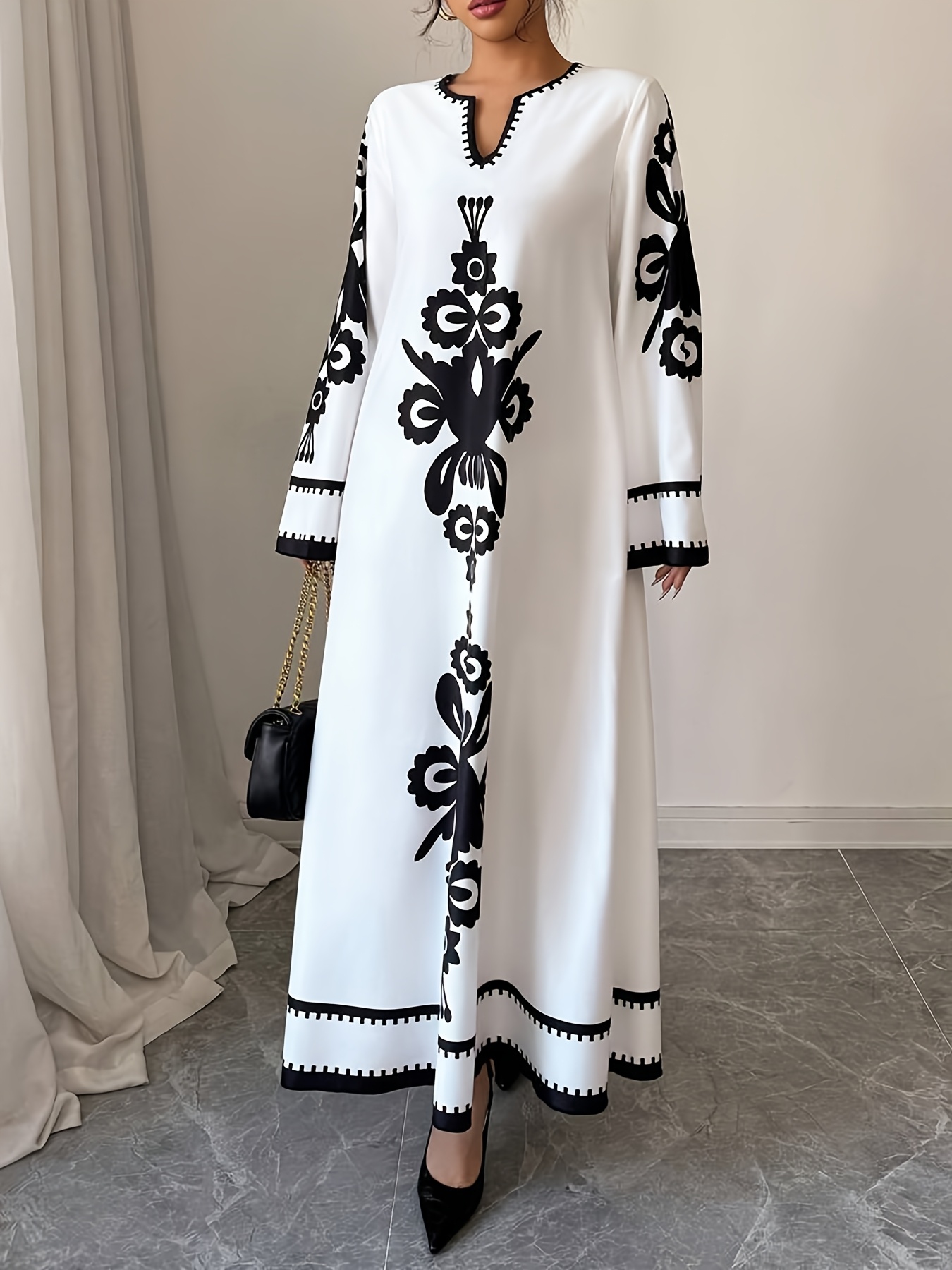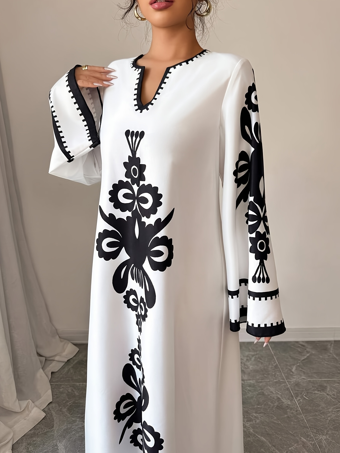 Plus Size – Women’S Plus Size V-Neck Long Sleeve Dress with Floral Print – Casual Loose Fit, Black & White Design, Perfect for Spring/Summer, Casual Summer Dress | Vneck Dress | Nonstretch Fabric