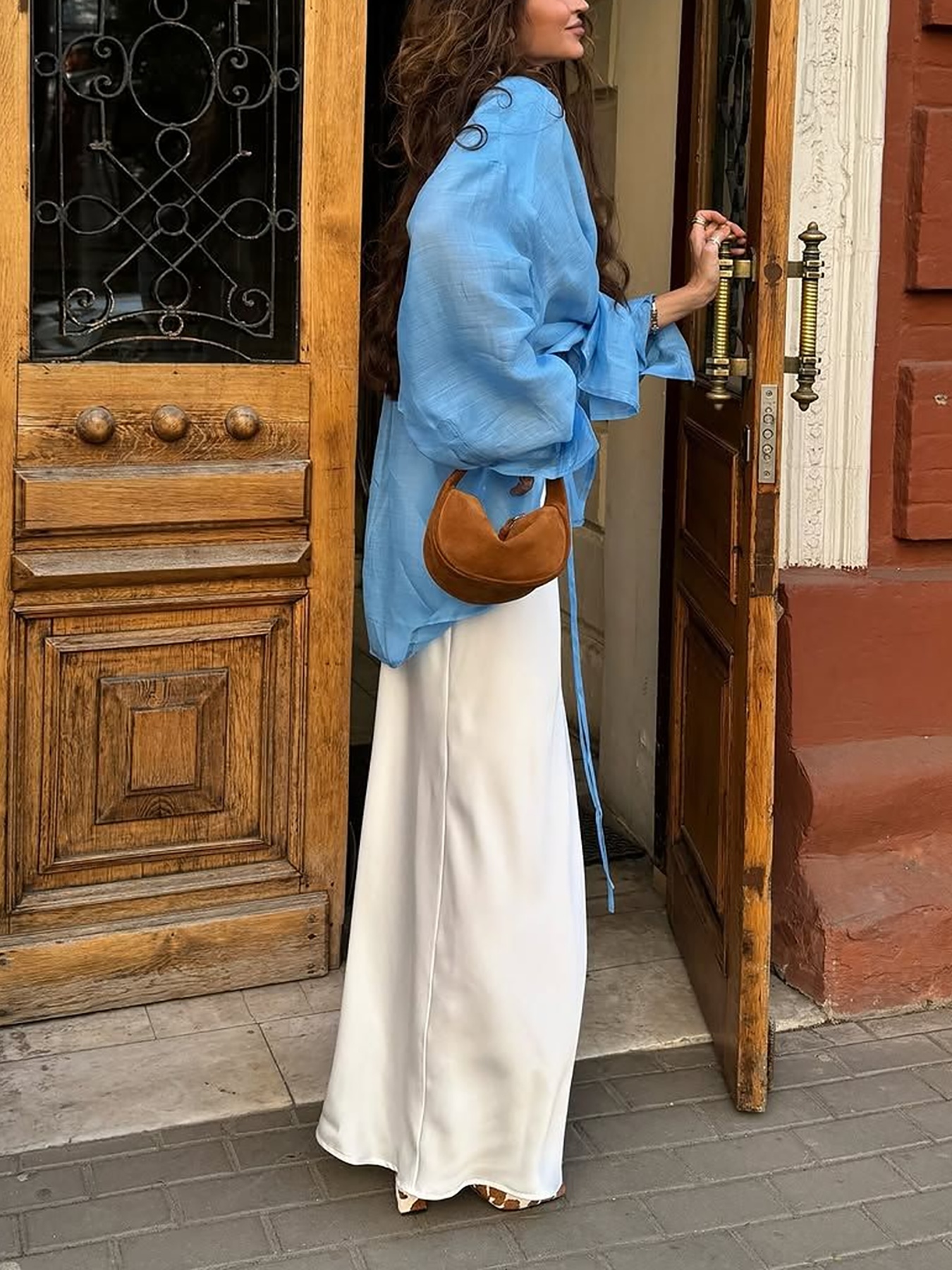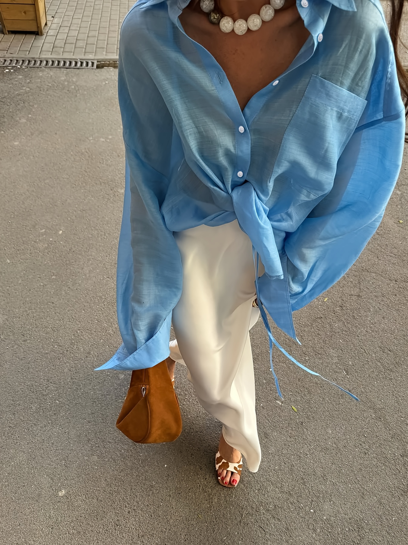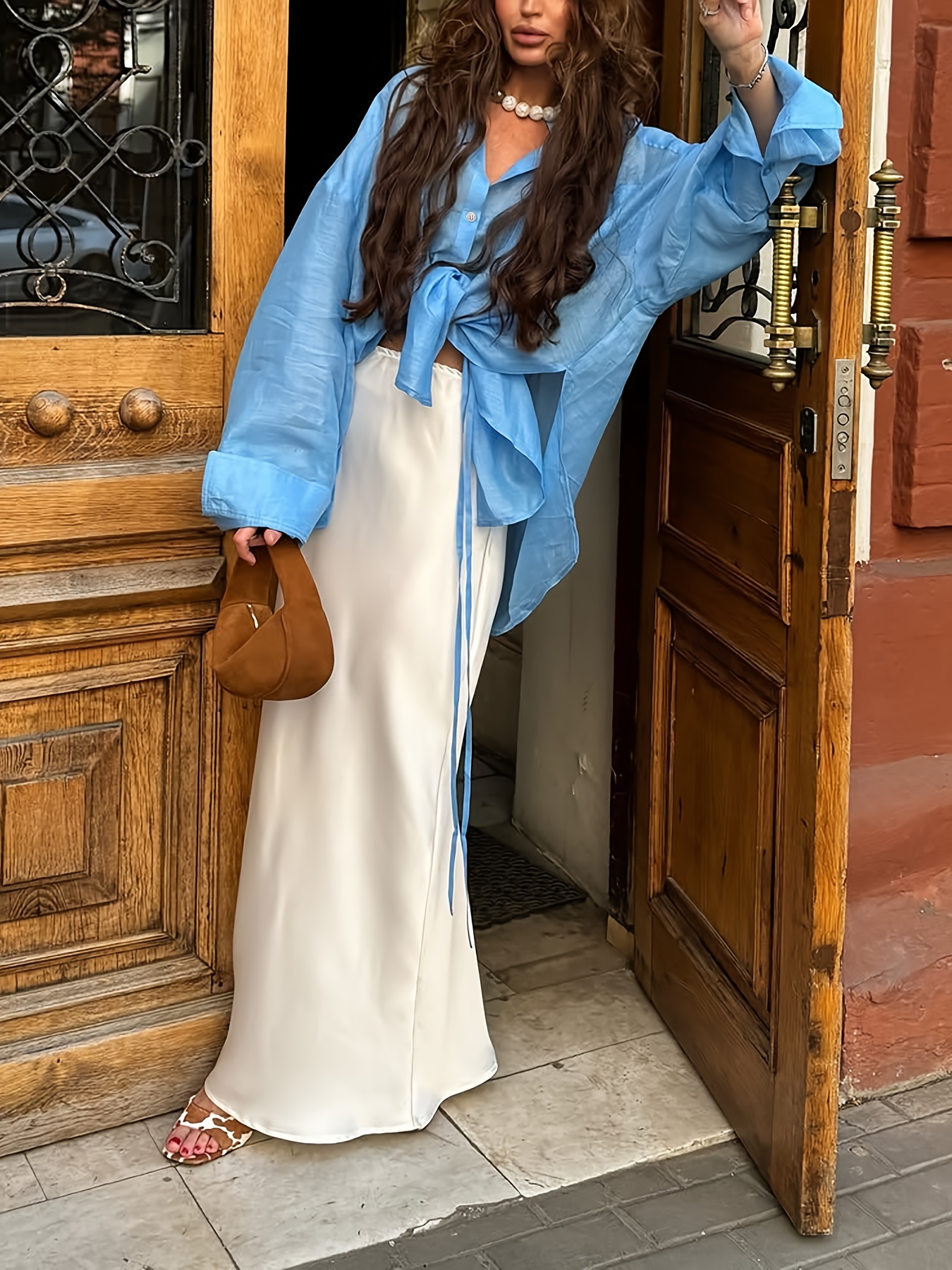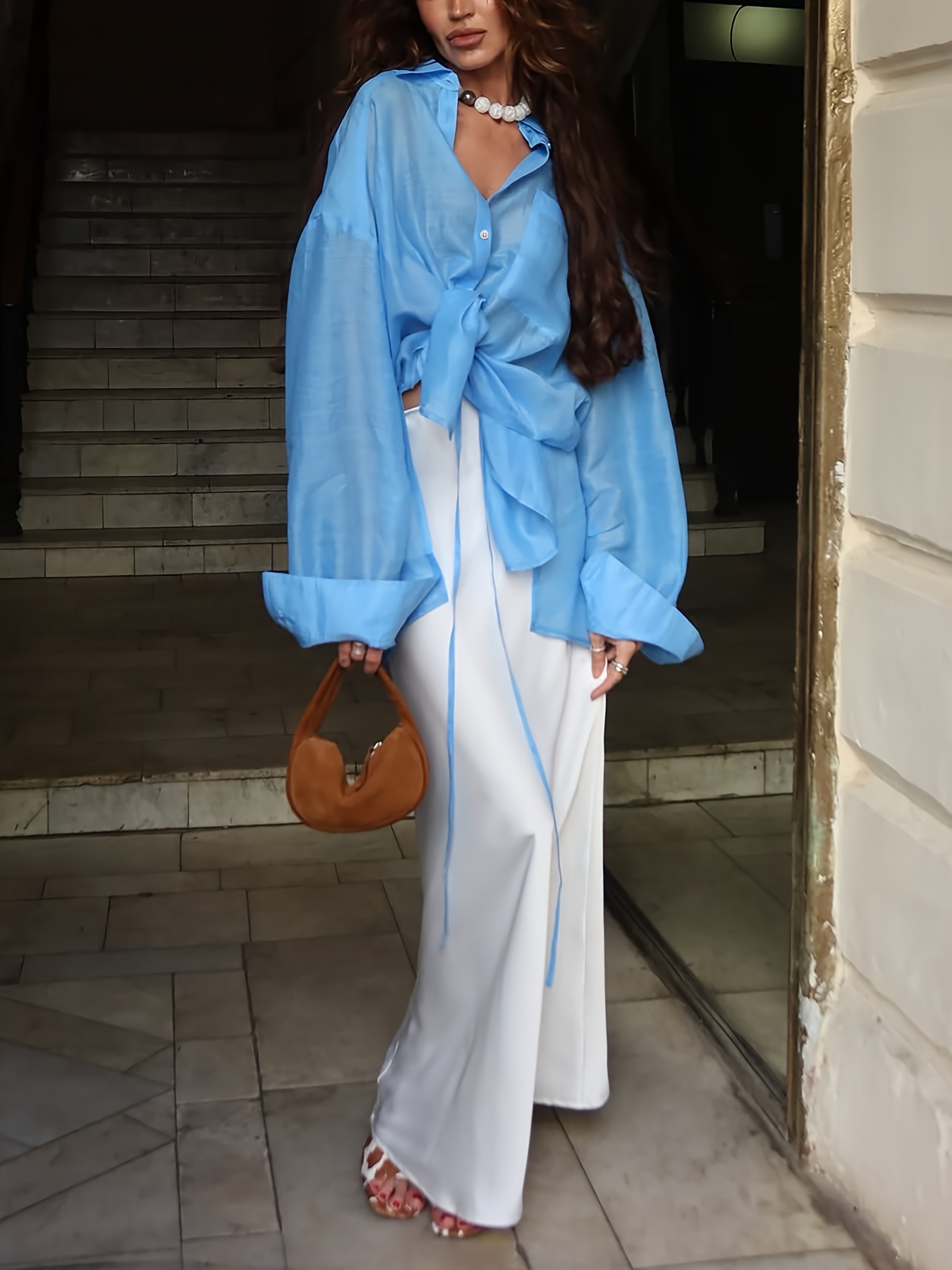Solid Color Button-Front Long Sleeve Turn- Collar Casual Shirt, Fashion Side Tie Long Sleeve Blouse for Women
