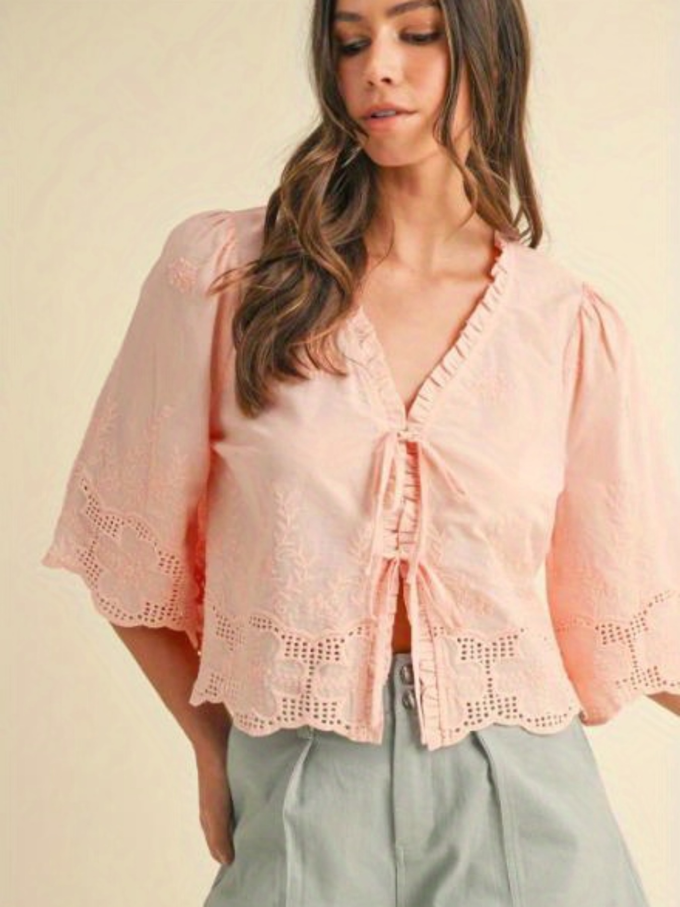 Women’s Soft Pink V-Neck Blouse – Tie-Front Top with Bubble Sleeves, Elegant Shirt for Everyday & Formal Outfits, Spring/Fall Wear