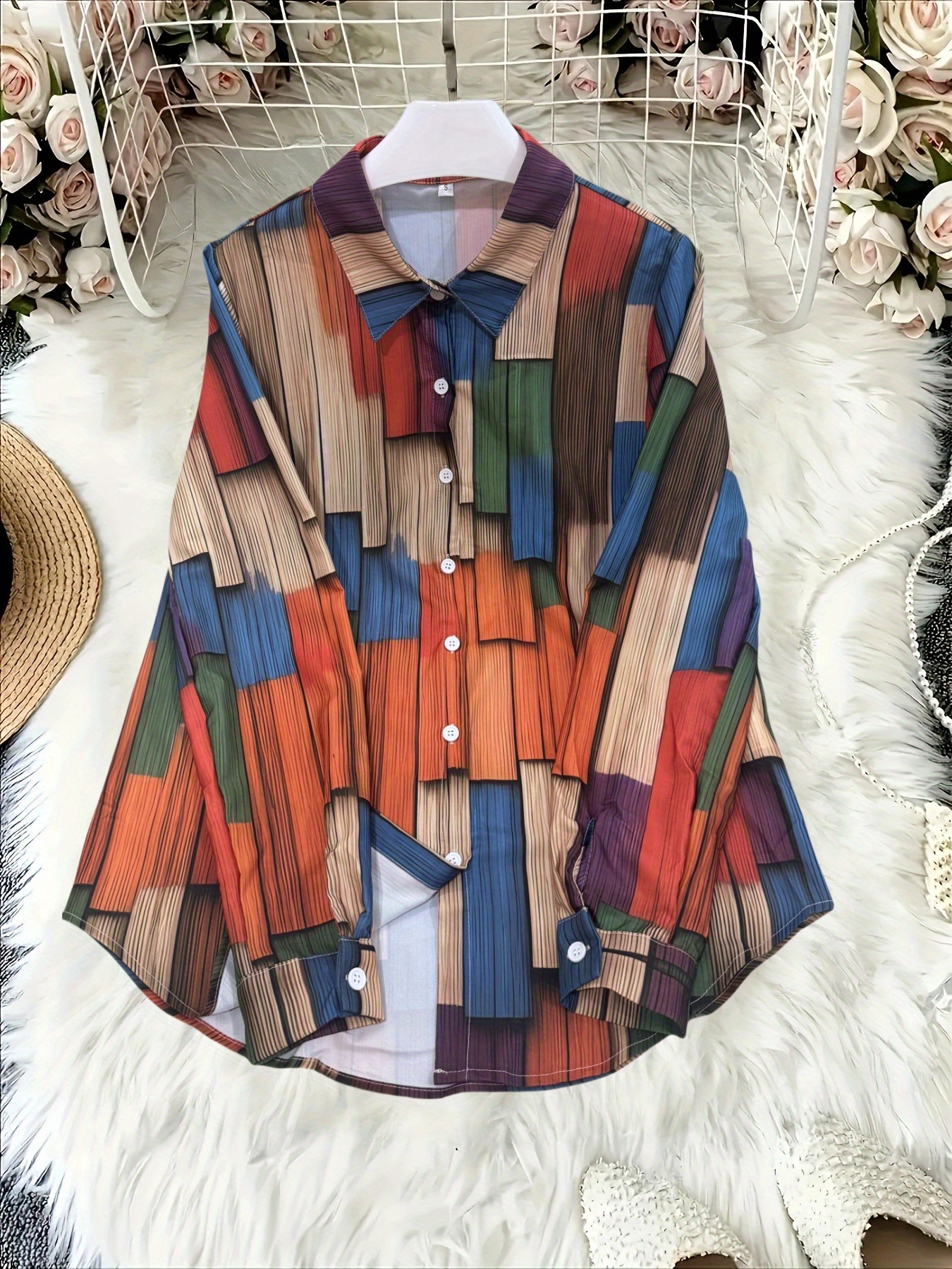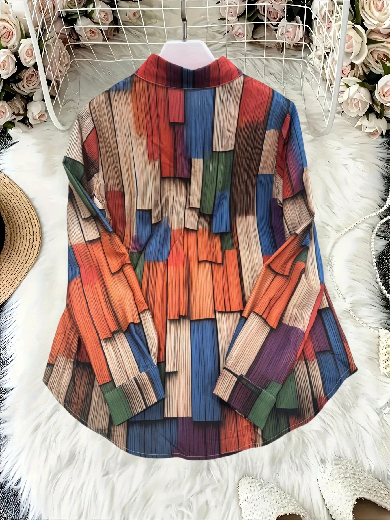 Women’S Casual Geometric Print Long Sleeve Button-Up Shirt – Vibrant Colorful Design, Collar, Lightweight & Breathable for Spring/Summer, Perfect for Casual Attire, Spring Summer Top | Geometric Pattern Top | Lightweight Shirt