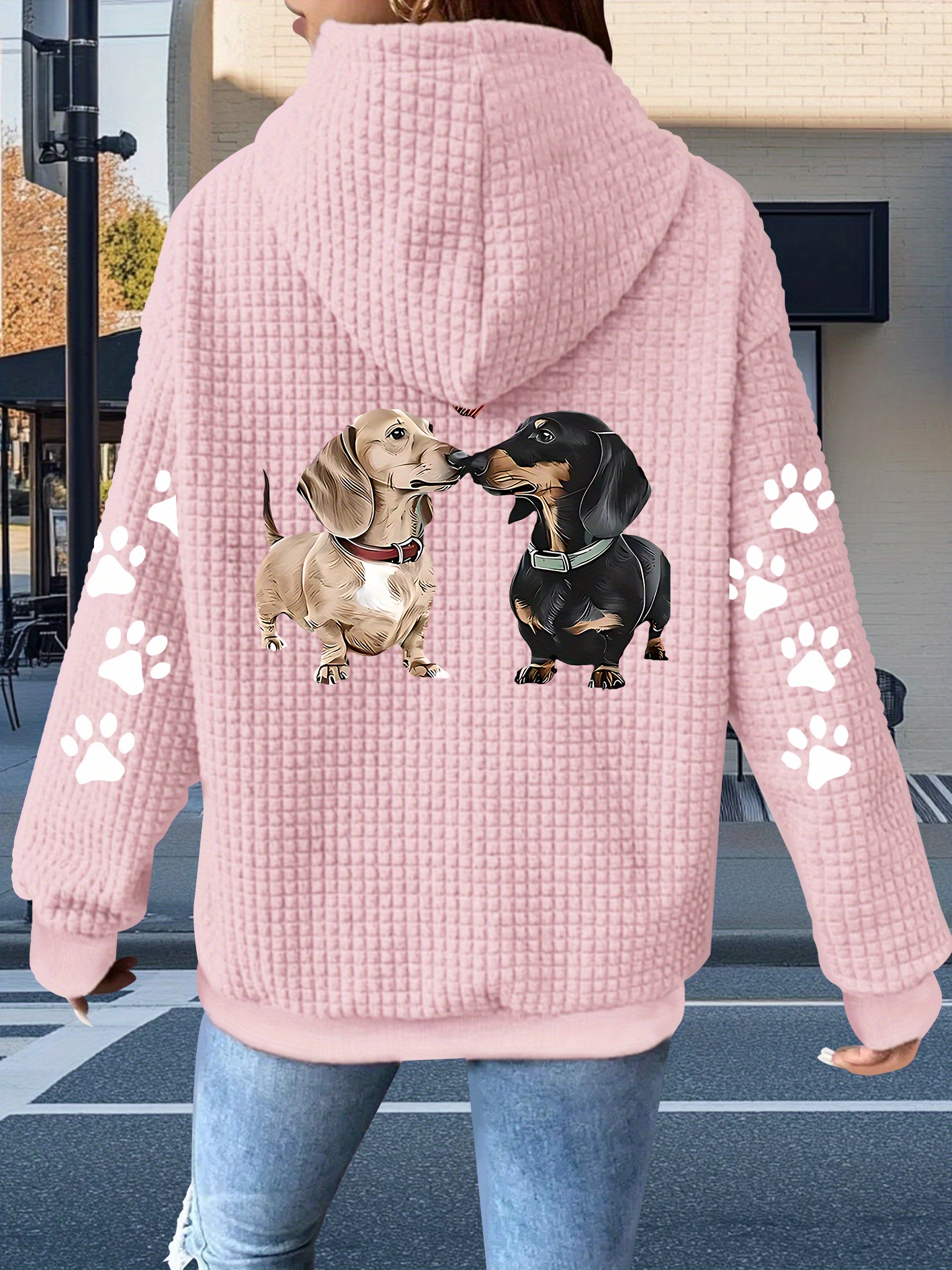 Women’s Casual Waffle Hoodie with Dog Print, Zipper and Drawstring – Polyester, Machine Washable, Geometric Pattern