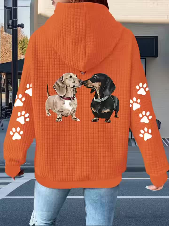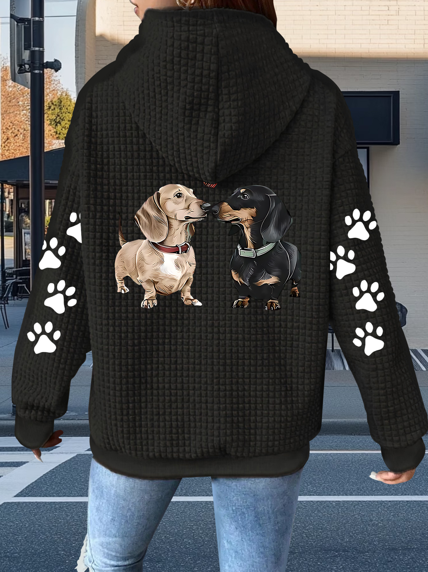 Women’s Casual Waffle Hoodie with Dog Print, Zipper and Drawstring – Polyester, Machine Washable, Geometric Pattern