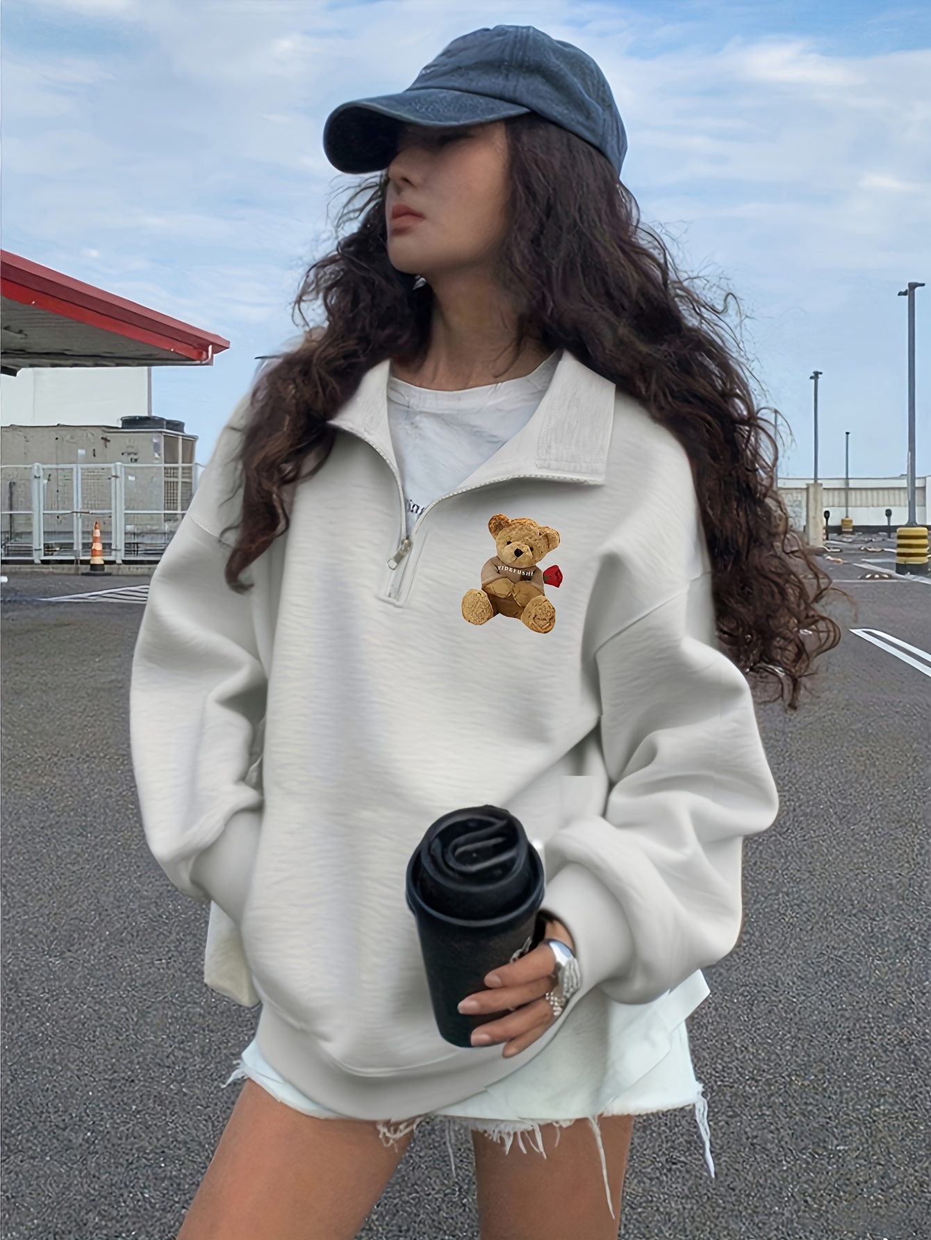 Women’S Cozy Fleece Sweatshirt with Adorable Bear & Heart Design – Casual Long Sleeve Pullover, Brown with Trim, Perfect for Fall/Winter, Casual Winter Wear | Playful Design | Stretchy Fabric