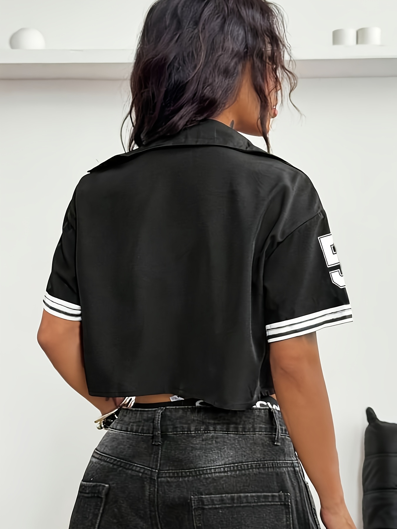 Women’S Cropped Shirt – Black with White Lettering, Button-Front Placket, Lightweight Top for Casual Outfits, Streetwear, Everyday & Formal Events – Spring/Summer Essential Wardrobe Staple, Summer Fashion, Streetwear Style, Comfortable Fit, Stylish Blouse, Fashion Lovers, Spring Wardrobe, Trendy Blouse, Breathable Material, Short Sleeve Blouse, Fashionforward Women