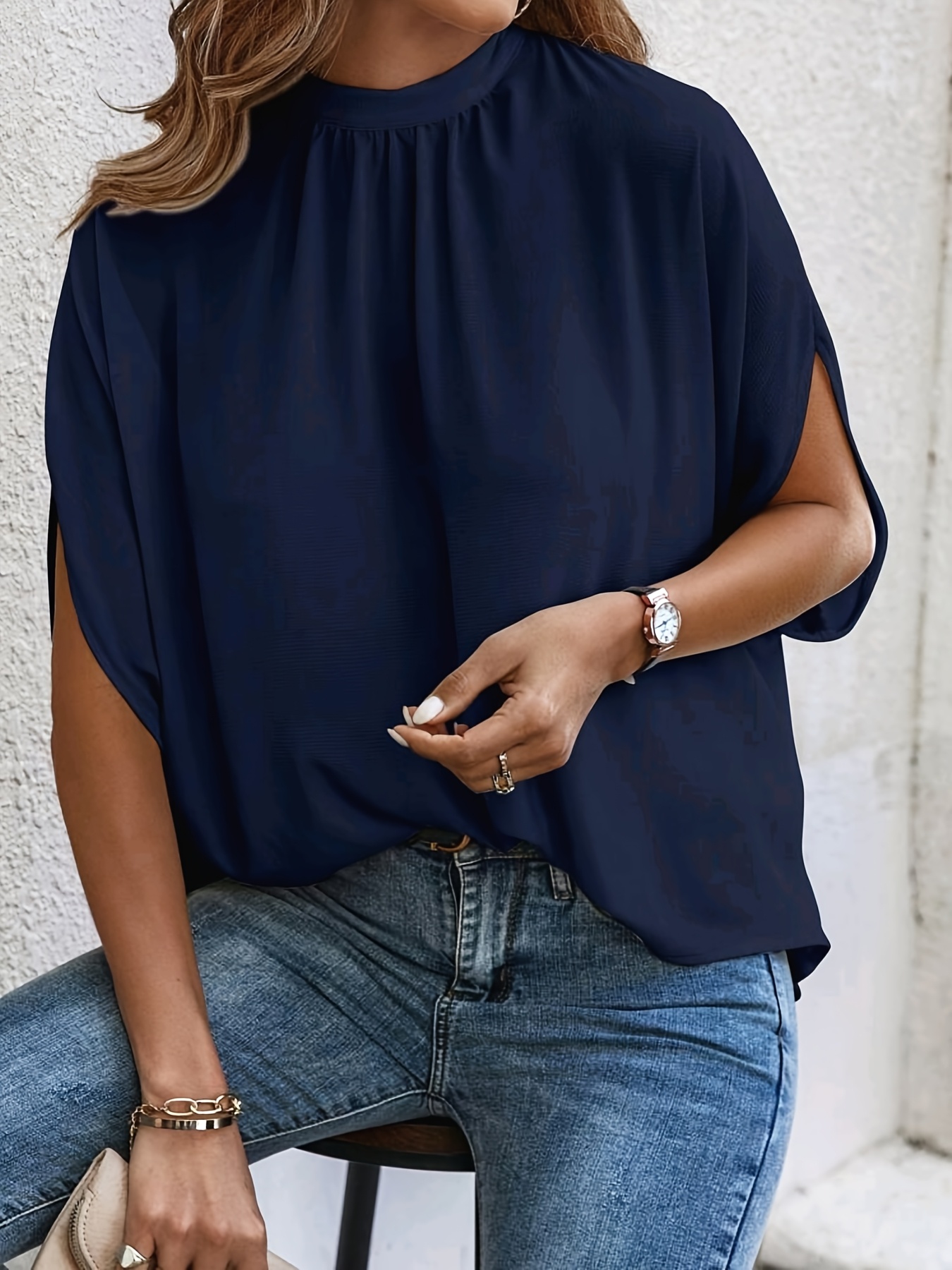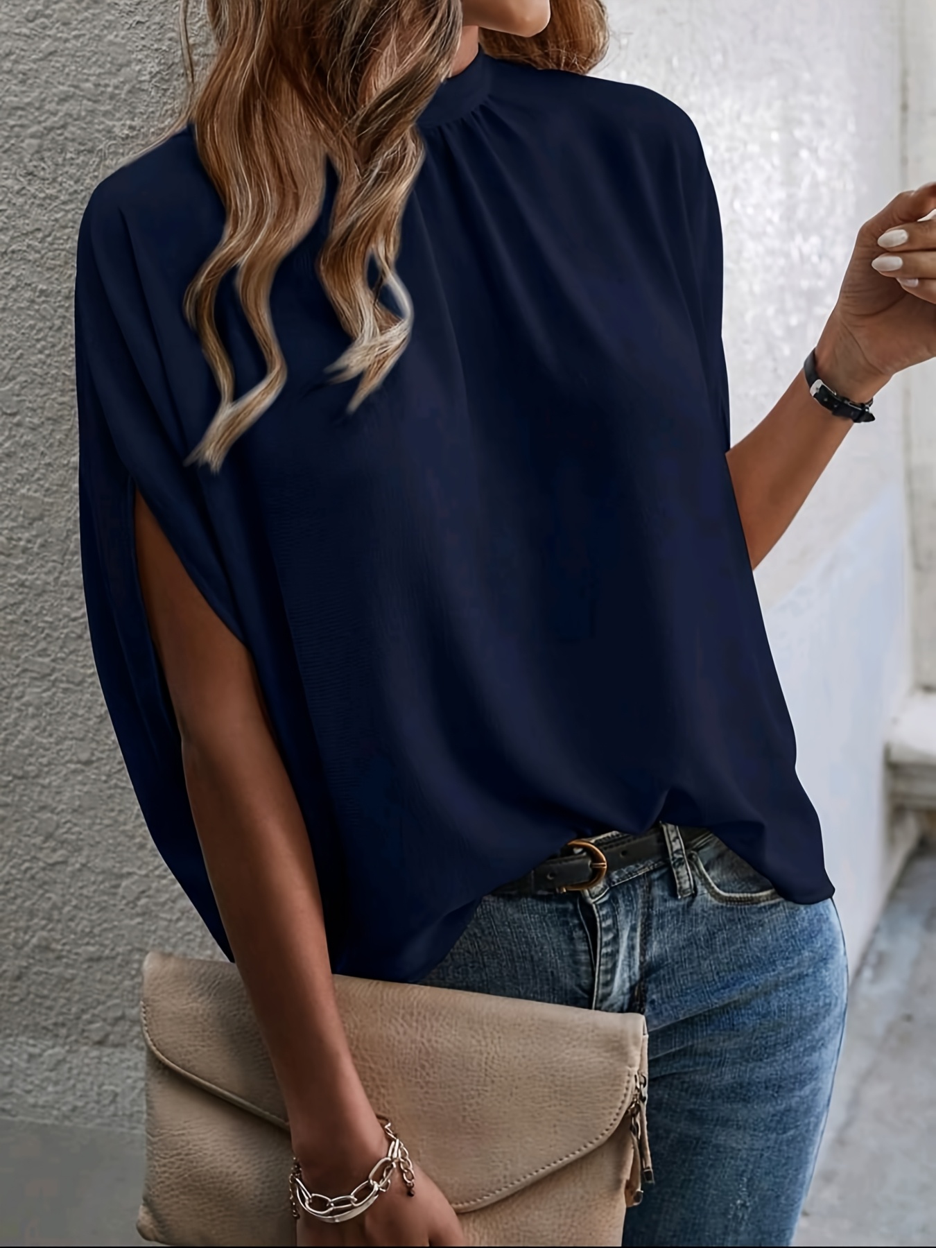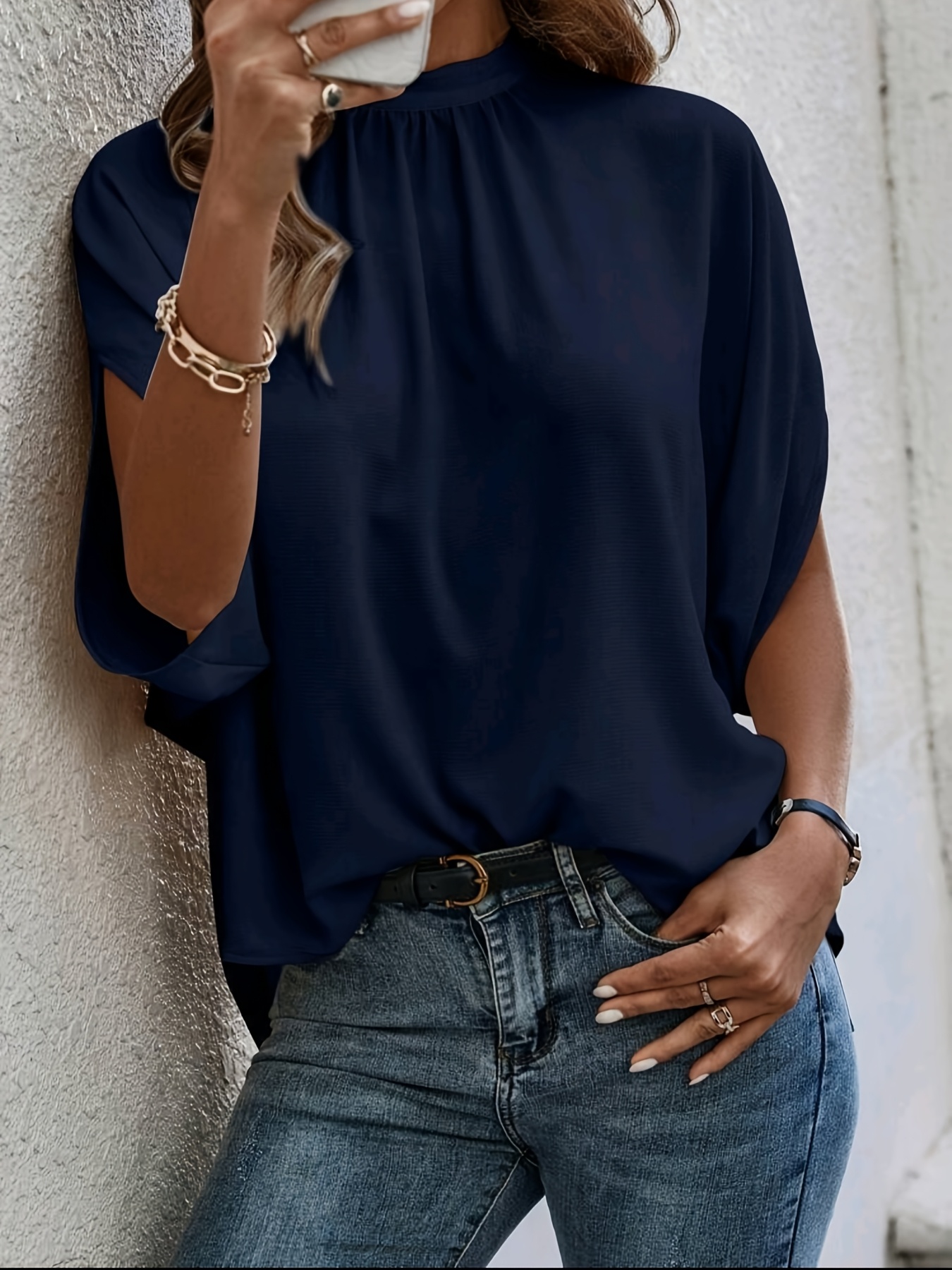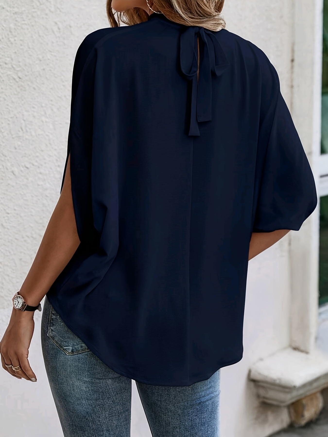 Women’s Elegant Batwing Sleeve Blouse – Loose Fit Round Neck Short Sleeve Shirt with Back Tie Detail, Solid Color Office & Casual Top for Spring/Summer, Machine Washable, Casual Attire, Comfortable Textile, Easy Care Fabric