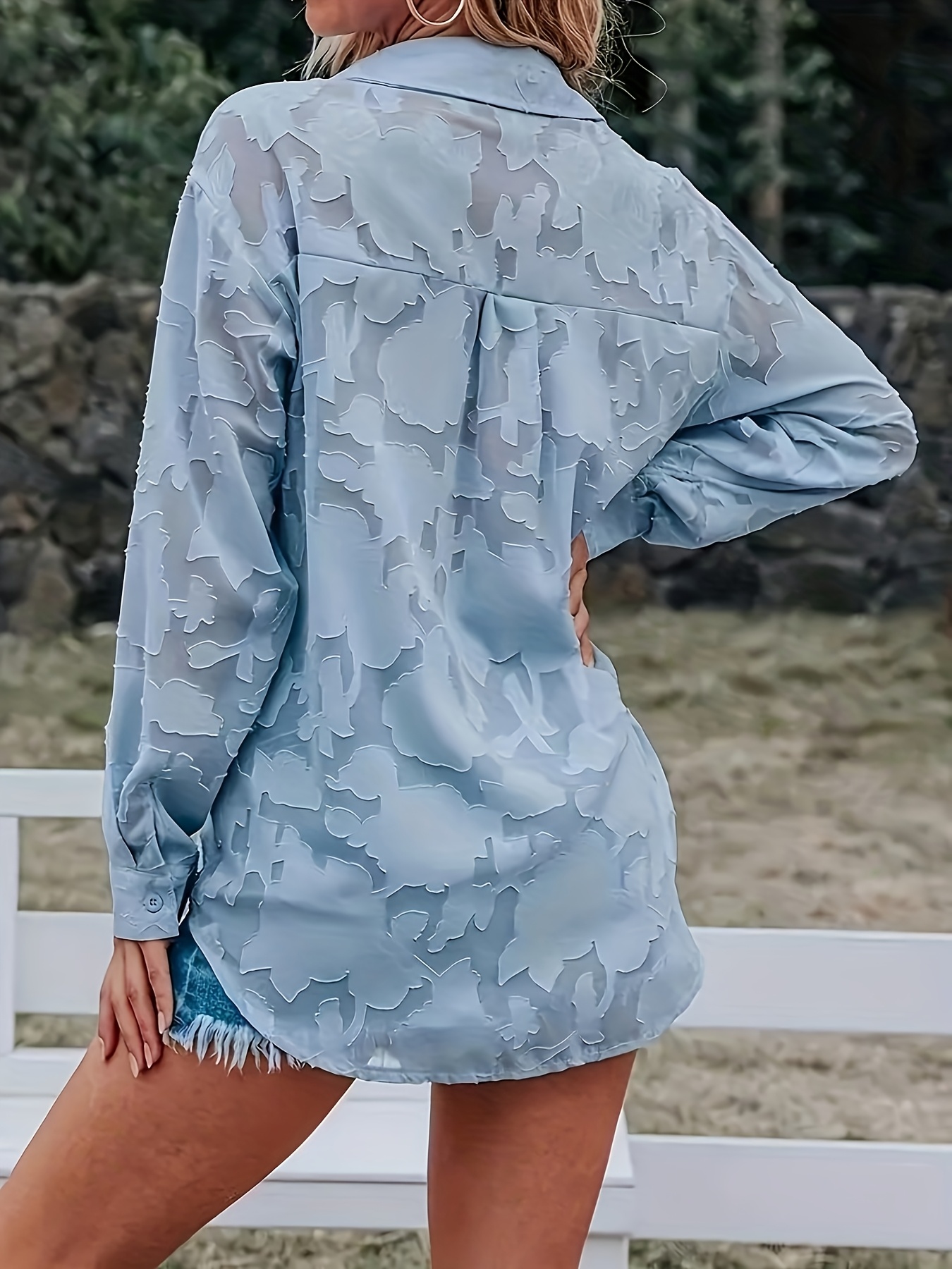 Women’s Elegant Blouse – Semi-Sheer Loose Fit Long Sleeve Shirt with Floral pattern, Button Front Placket Blouse for Casual & Formal Outfits – Machine Washable Women’s Tops, Floral Print Blouse, Relaxed Fit Top, Textured Fabric Shirt