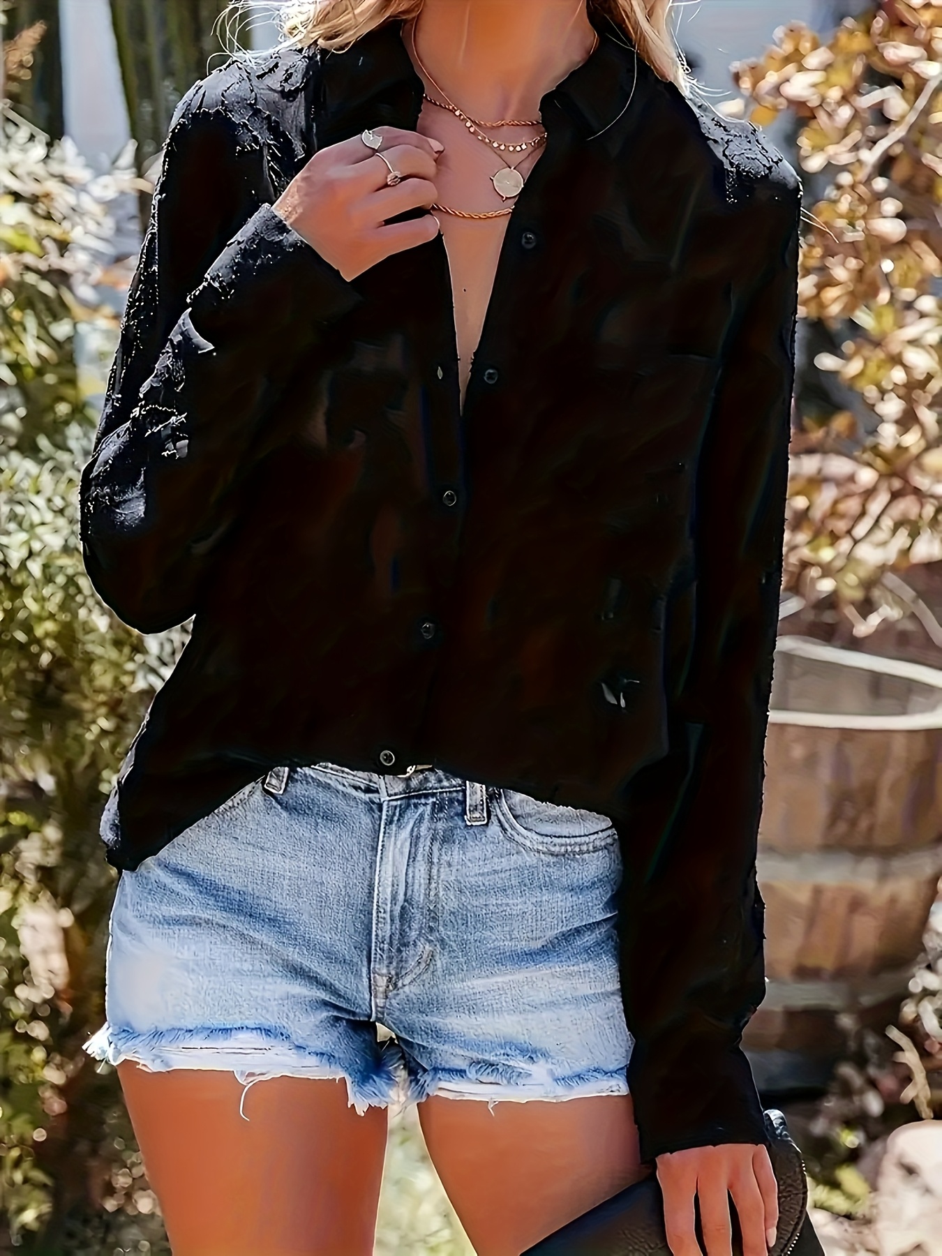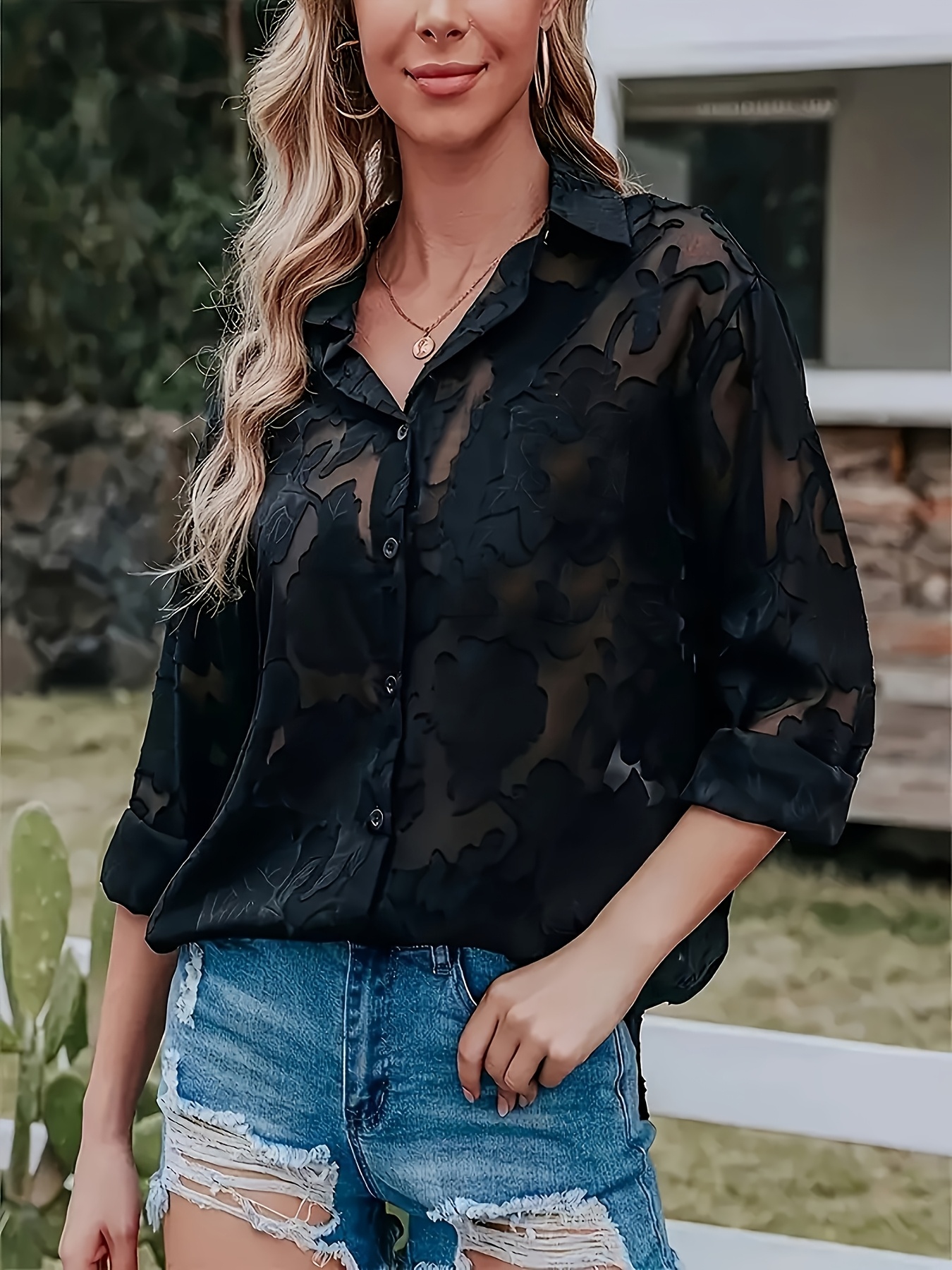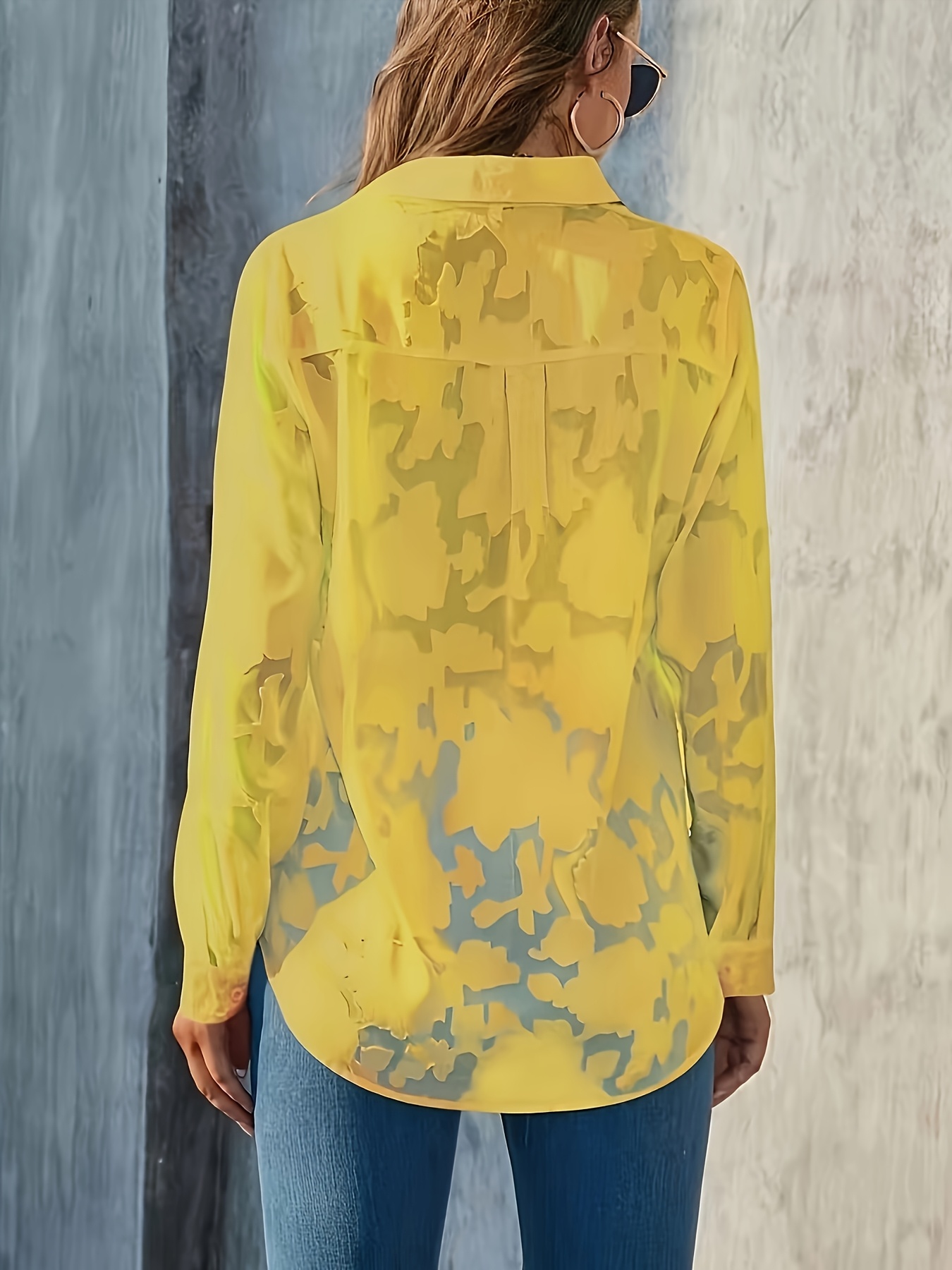 Women’s Elegant Blouse – Semi-Sheer Loose Fit Long Sleeve Shirt with Floral pattern, Button Front Placket Blouse for Casual & Formal Outfits – Machine Washable Women’s Tops, Floral Print Blouse, Relaxed Fit Top, Textured Fabric Shirt