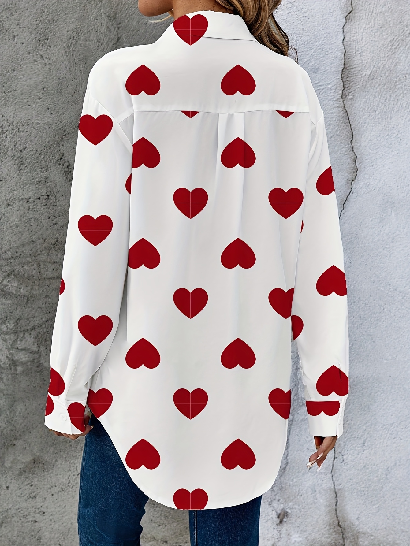 Women’S Elegant Red Heart Print Blouse – Long Sleeve, Casual Fashion, Perfect for Everyday Wear & Valentine’S Day, Valentine’S Day Gift|Casual Fashion Blouse|Single Breasted Placket, Valentines Day Gifts for Her