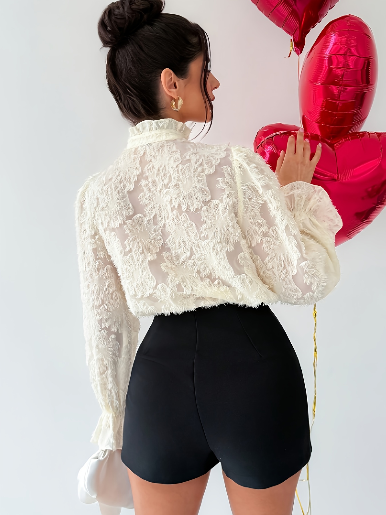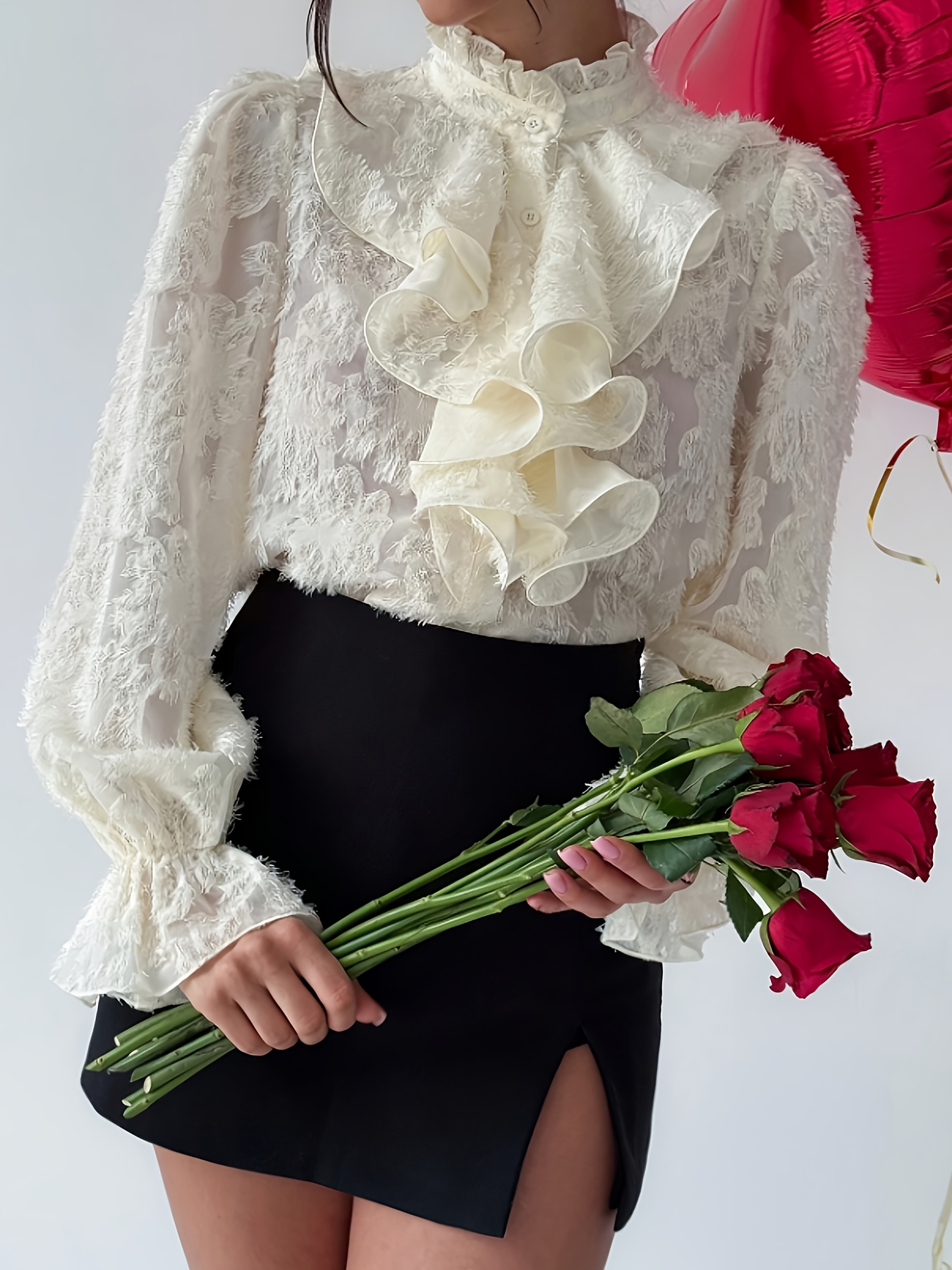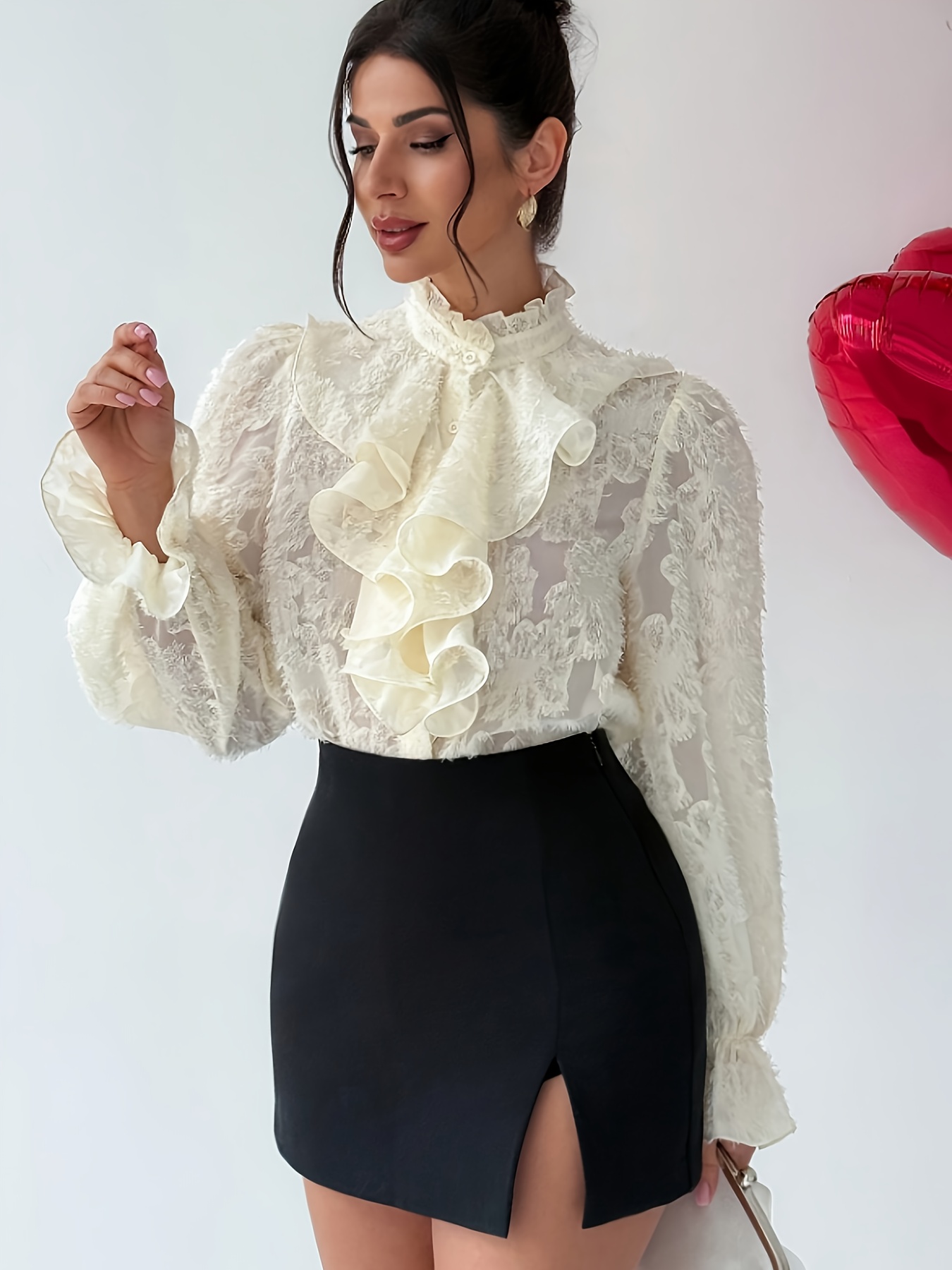 Women’S Elegant Ruffled Lace Blouse – Long Sleeve Button-Front Shirt with Stand Collar, Non-Stretch Fabric, All-Season Layering Top for Casual & Formal Outfits – Women’S Blouse, Versatile Clothing | Ruffled Detailing | Subtle Sheen Finis