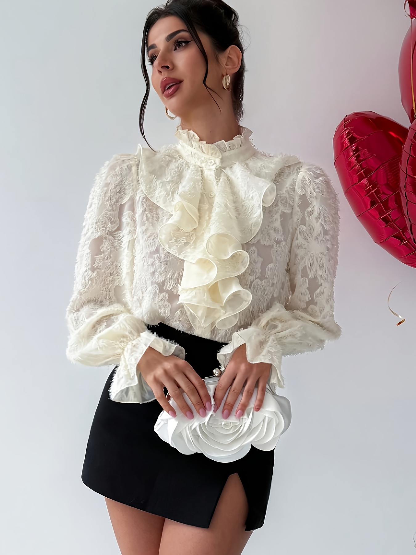 Women’S Elegant Ruffled Lace Blouse – Long Sleeve Button-Front Shirt with Stand Collar, Non-Stretch Fabric, All-Season Layering Top for Casual & Formal Outfits – Women’S Blouse, Versatile Clothing | Ruffled Detailing | Subtle Sheen Finis