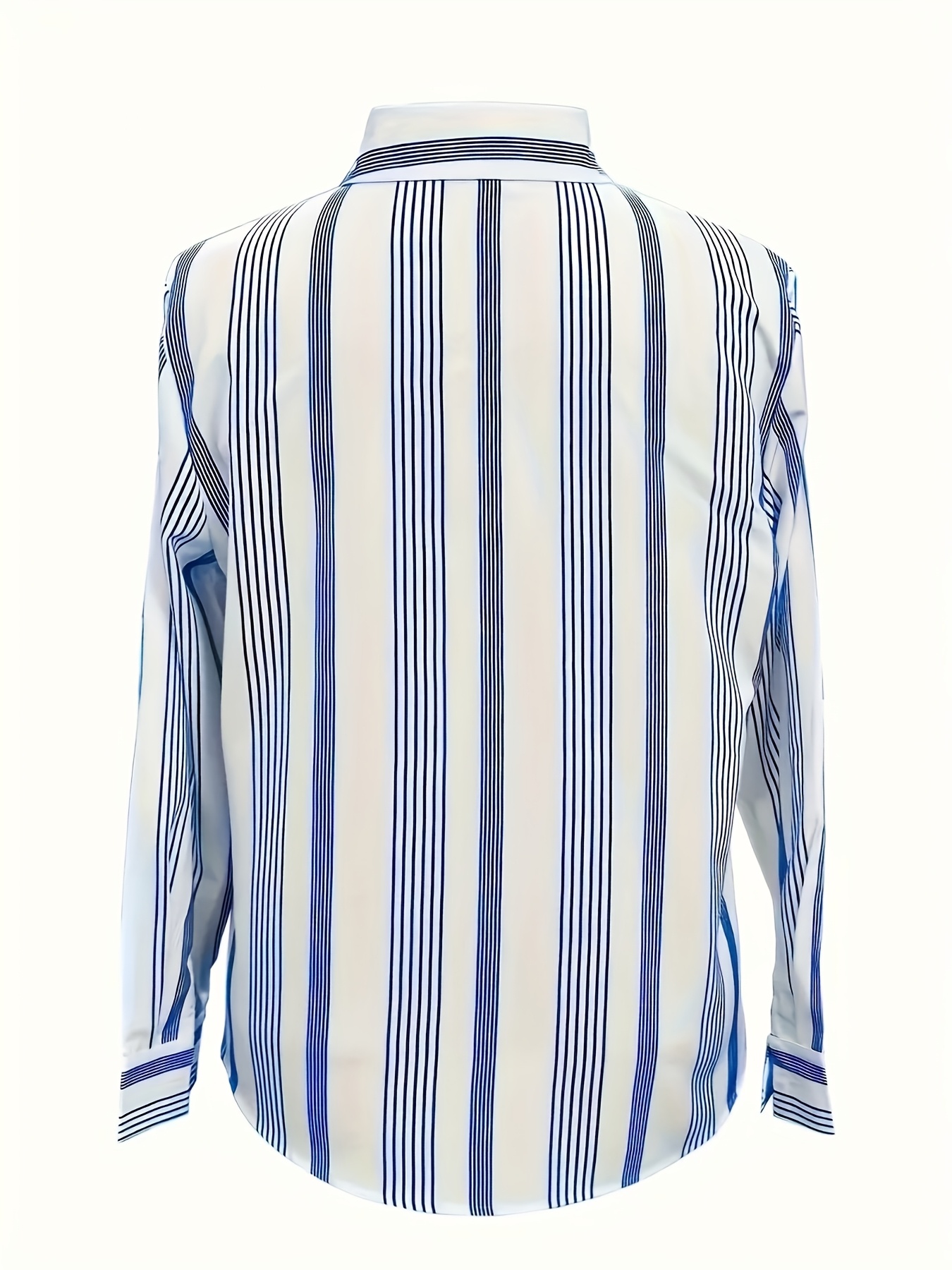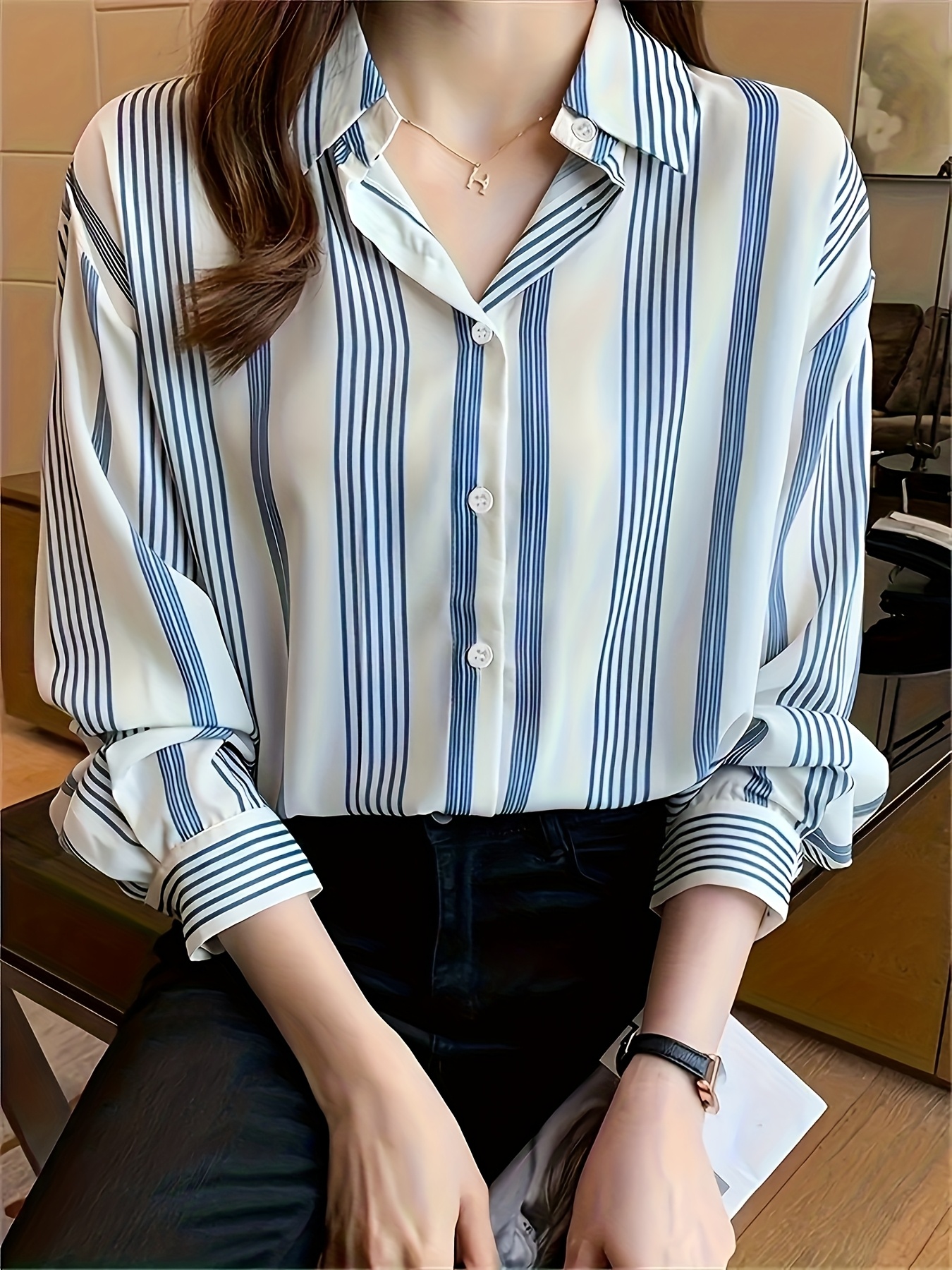 Women’S Elegant Striped Long Sleeve Shirt, 100% Polyester Woven Fabric, Lapel Collar, Button-Up Casual Workwear, Spring/Summer/Fall Season, 120g/m² – Perfect for Adult