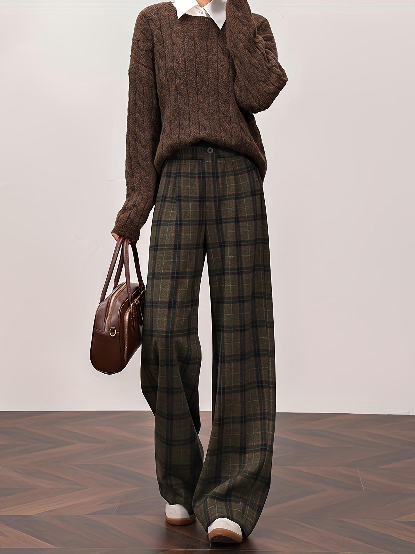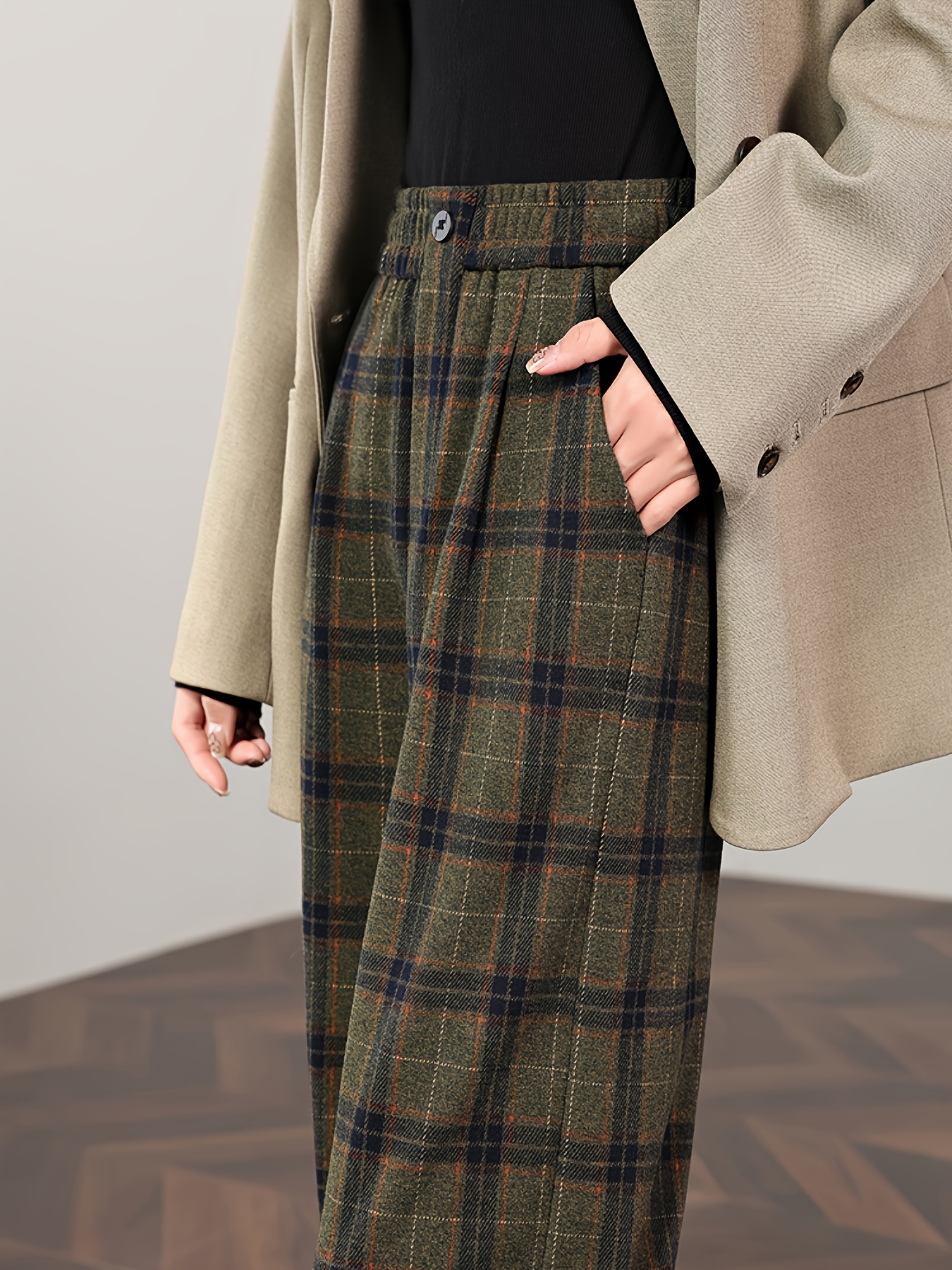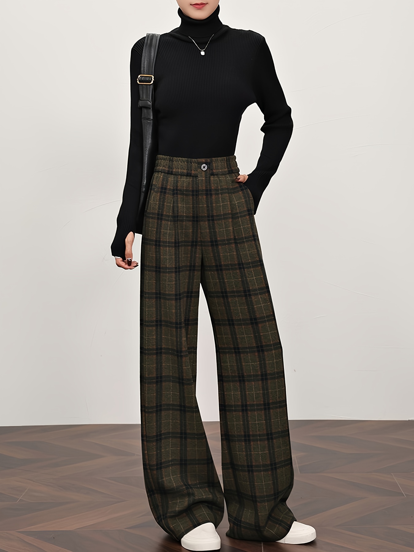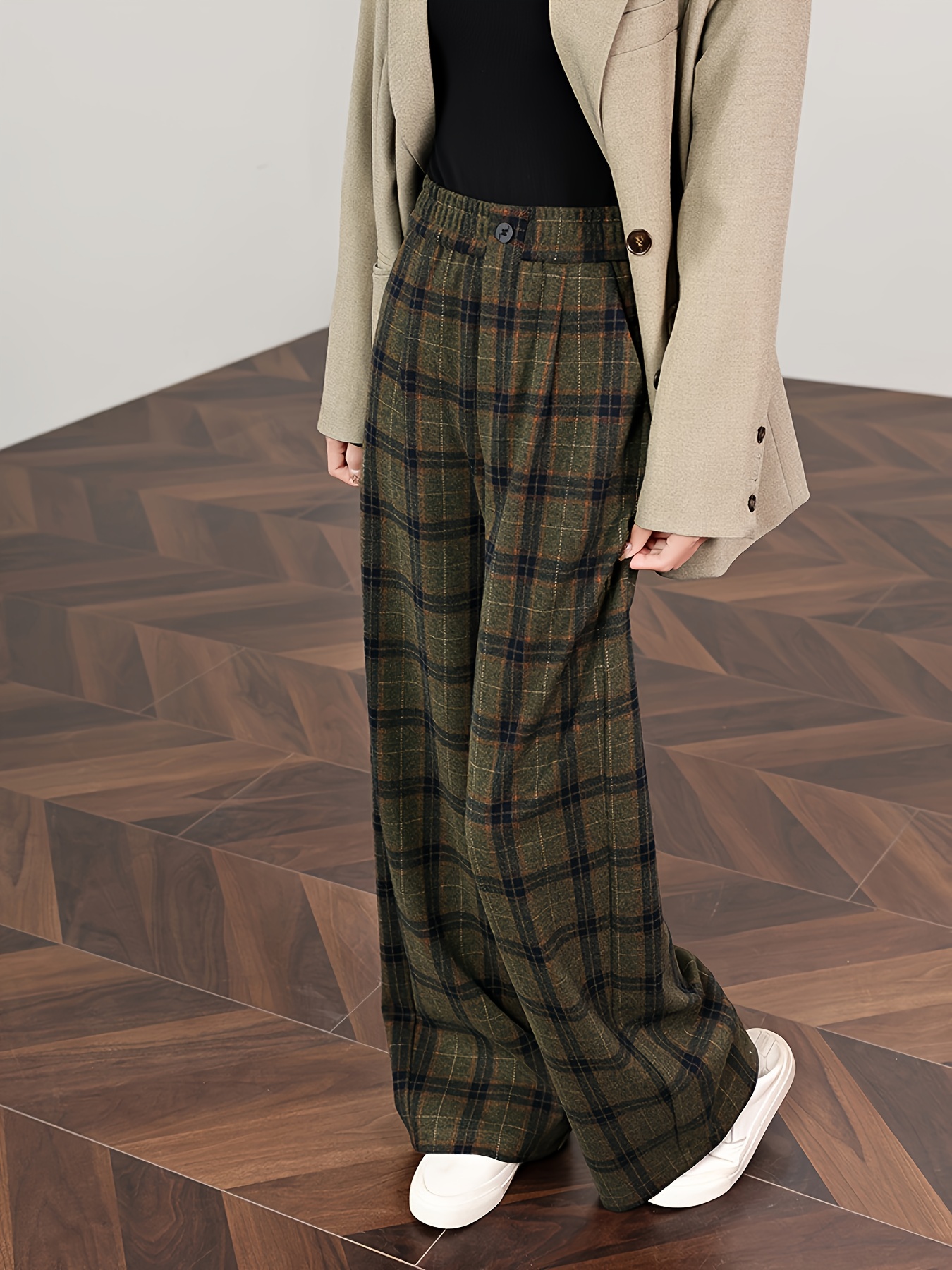 Women’s Plaid Wide-Leg Pants Green Tartan Tweed, Formal Casual