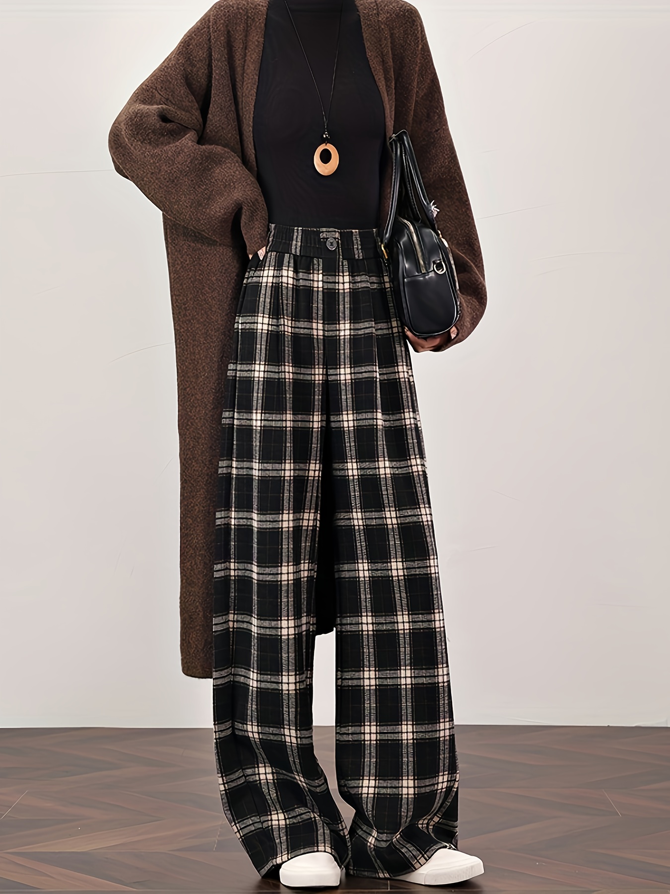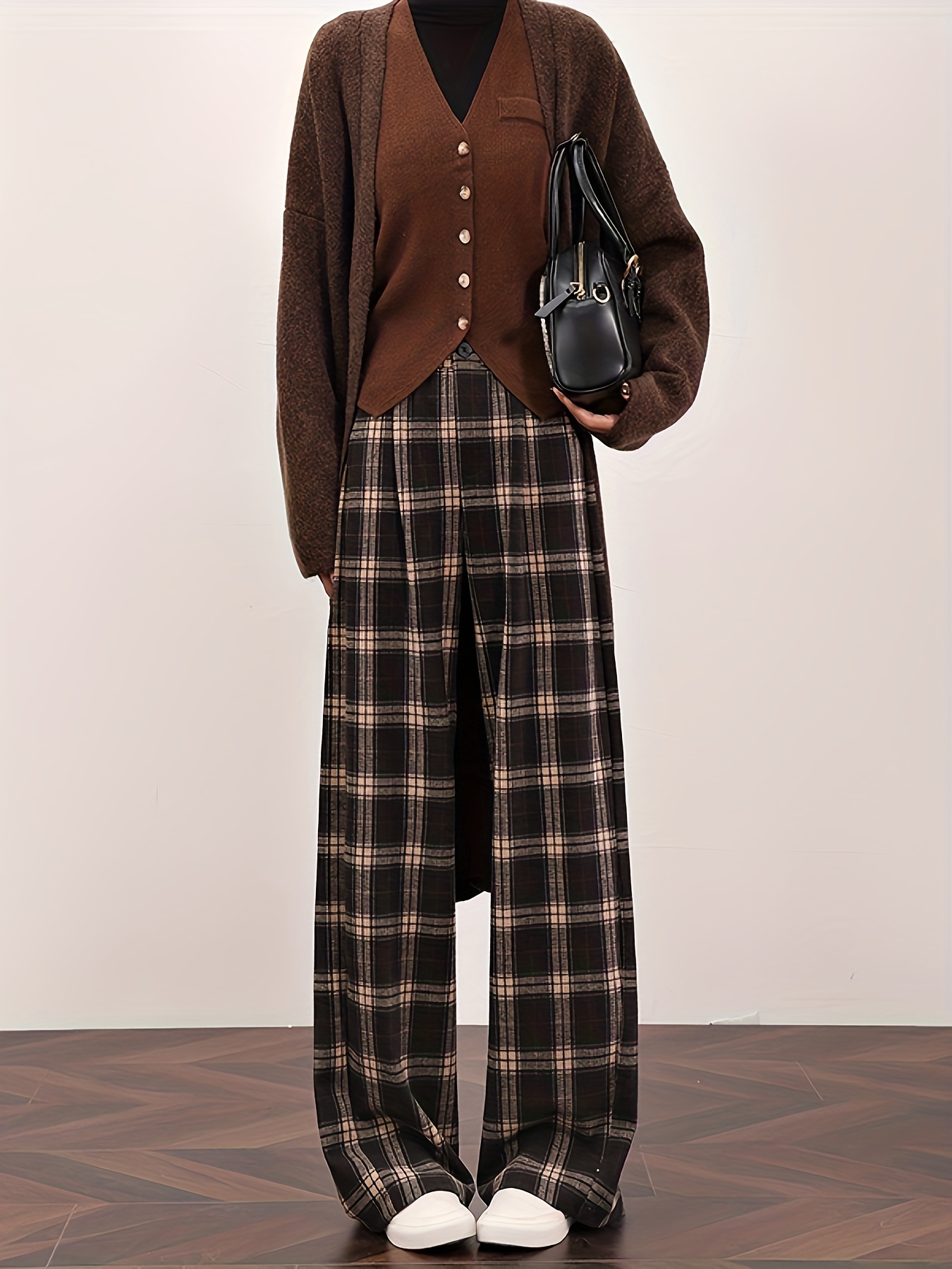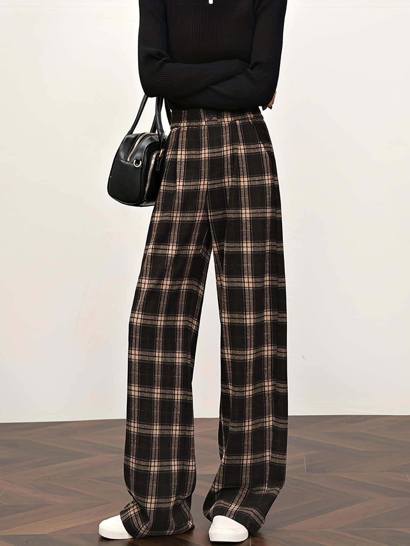 Women’s Plaid Wide-Leg Pants Green Tartan Tweed, Formal Casual