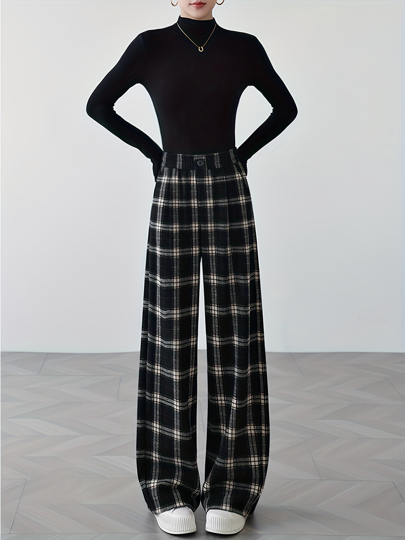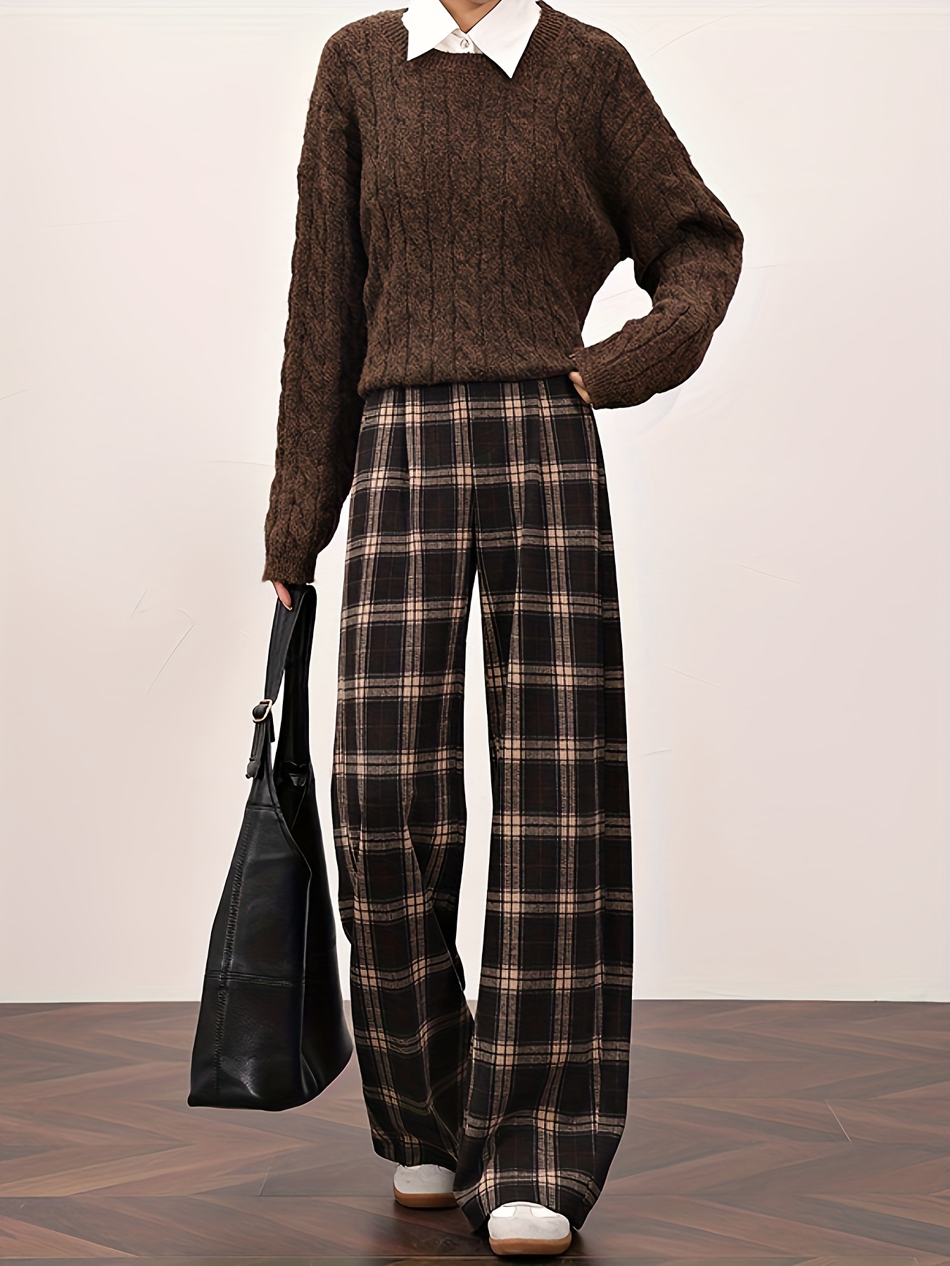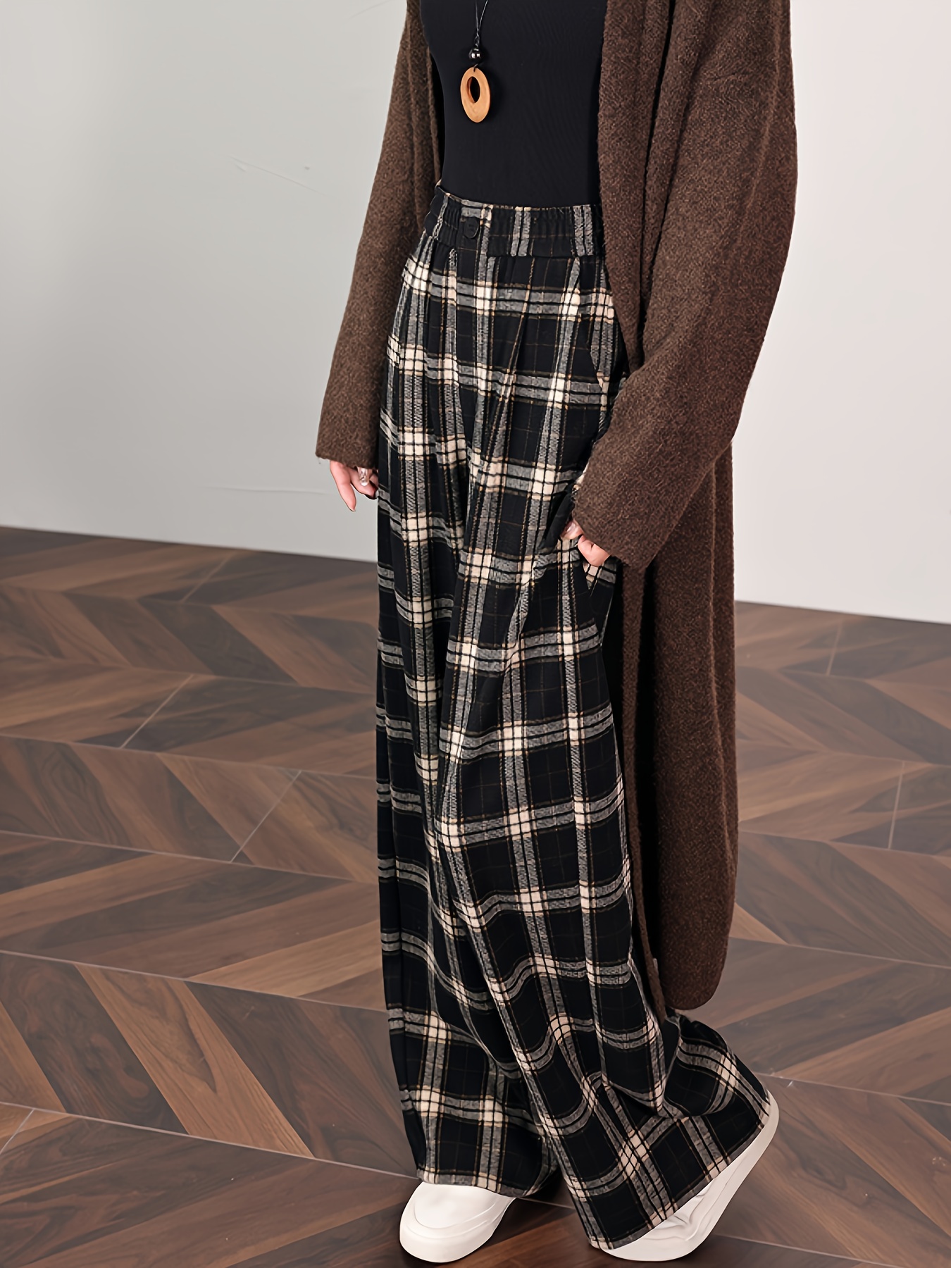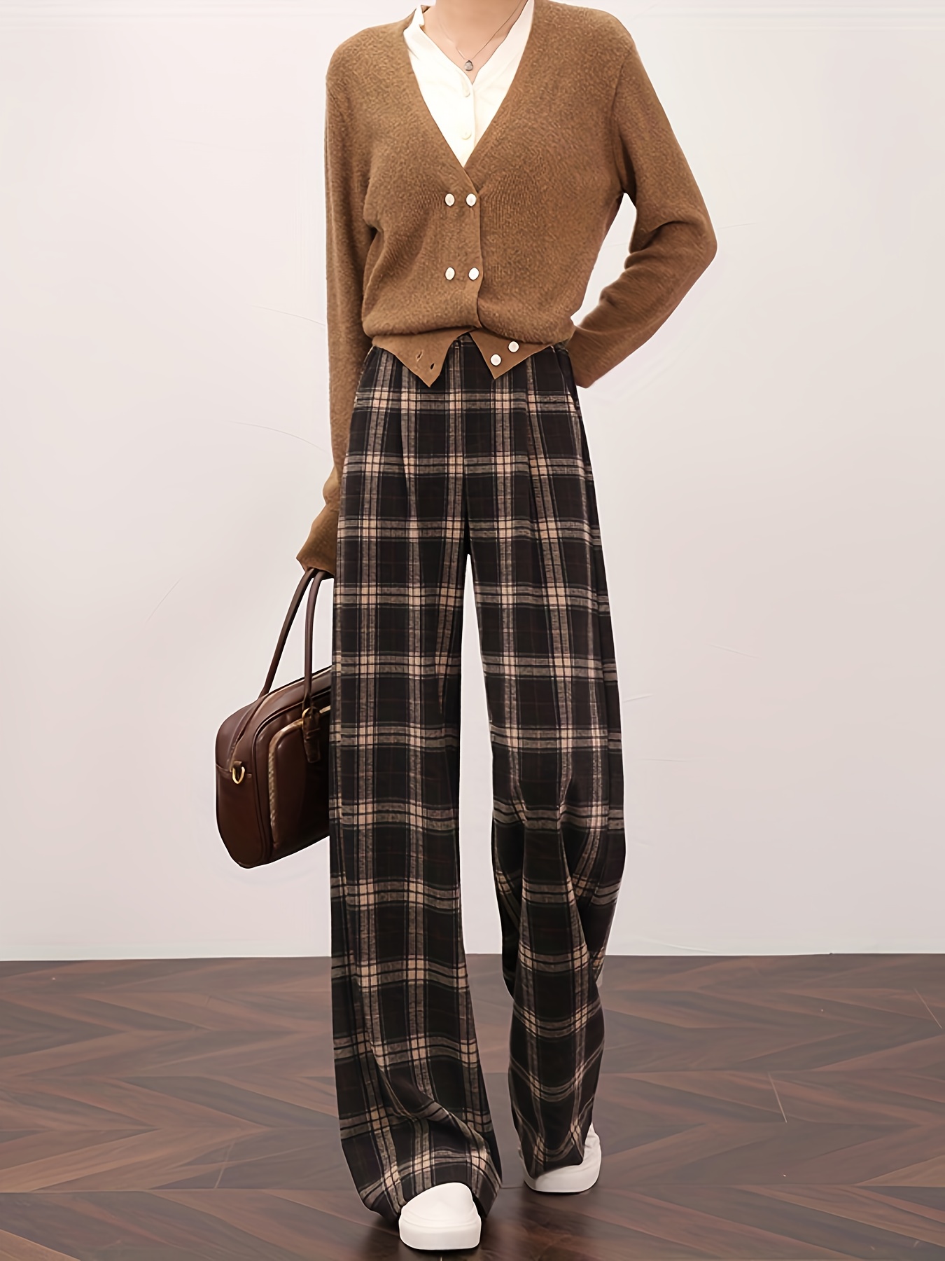 Women’s Plaid Wide-Leg Pants Green Tartan Tweed, Formal Casual