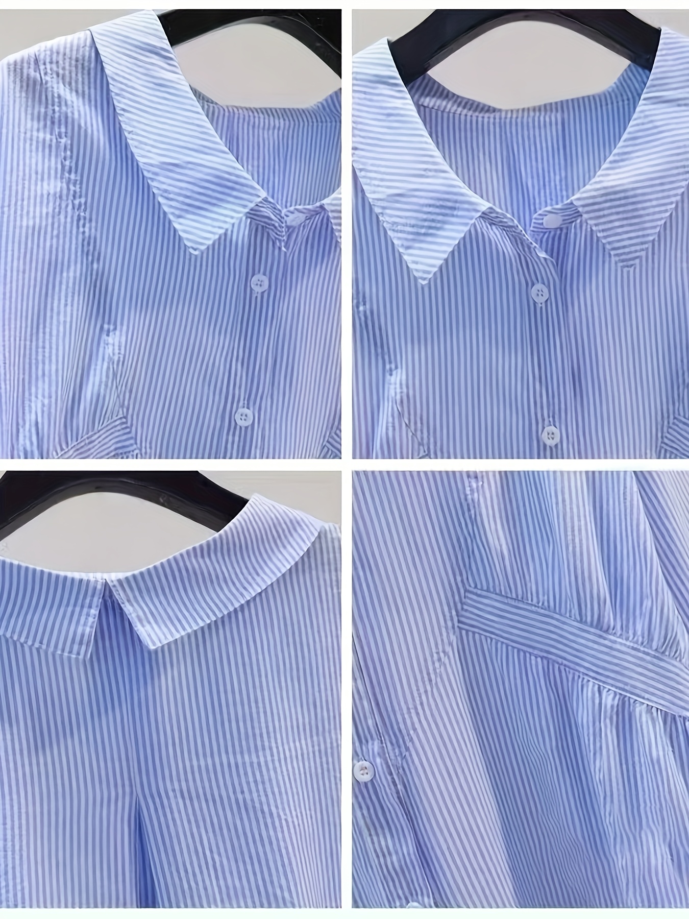 Women’S Light Blue & White Striped Button-Up Shirt – Square Neck Long Sleeve Blouse with Ruffled Cuffs, Versatile Fall/Winter Top for Casual or Dressy Outfits, Casual Wear | Ruffled Sleeve Top | Buttoned Collar, Ladies Blouses, Women’ Elegant Navy Blue Blouse, Women’ Elegant Navy Blue Top, Women Top And Blouse, Women Shirt And Blouse, Women Shirt Blouse, Striped Shirt Women, Blouse Women/summer, Knot Front Summer Top Women, Women Short Sleeve Shirt, Women Blouse On Cheap, Elegant