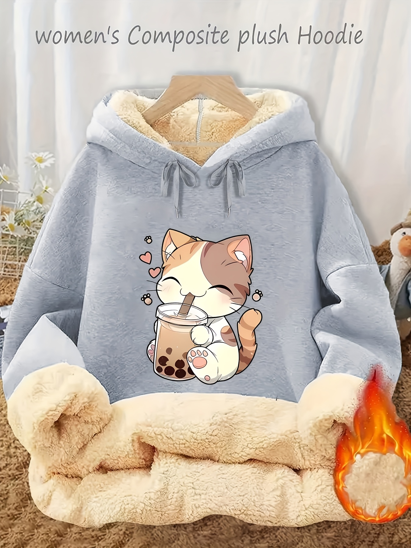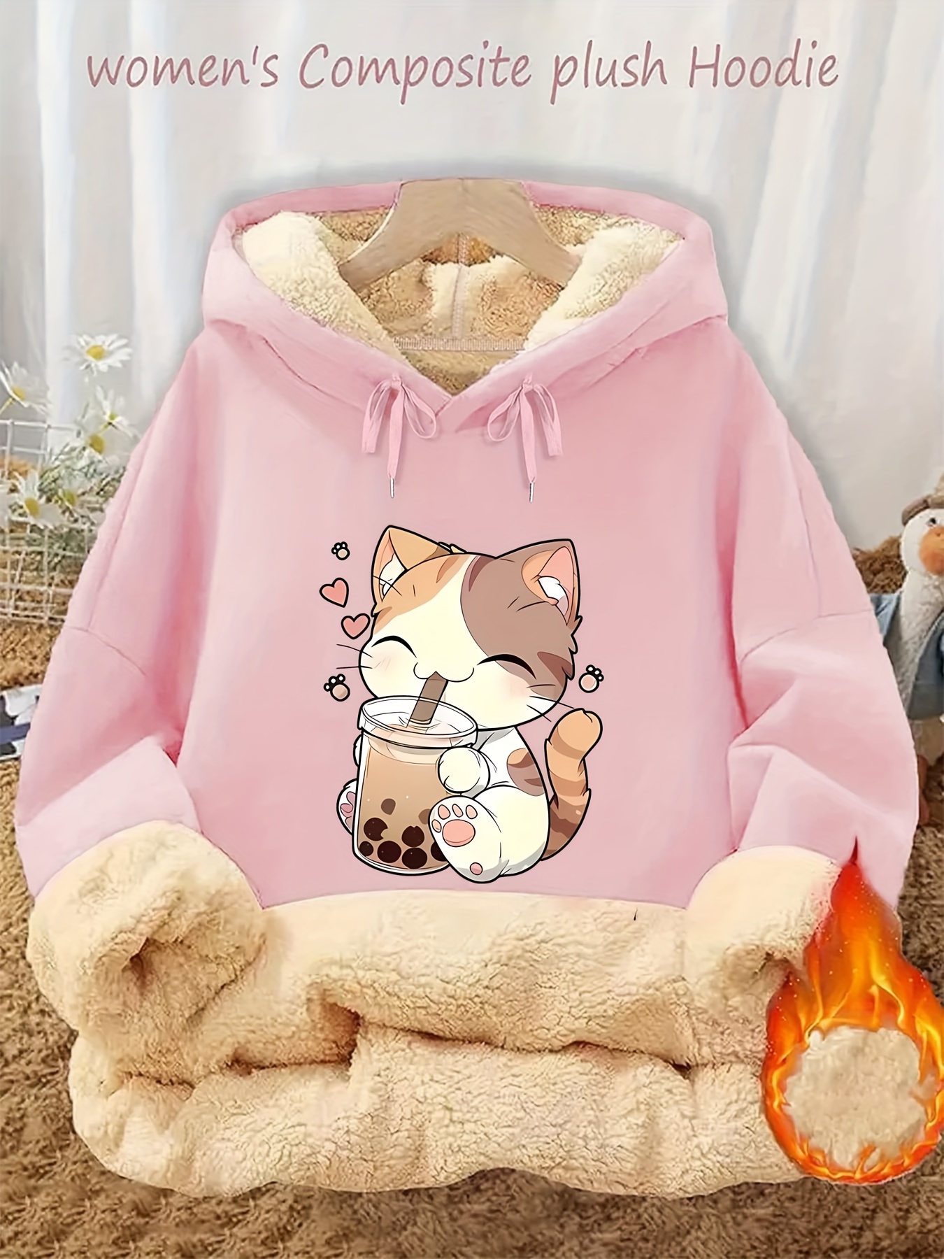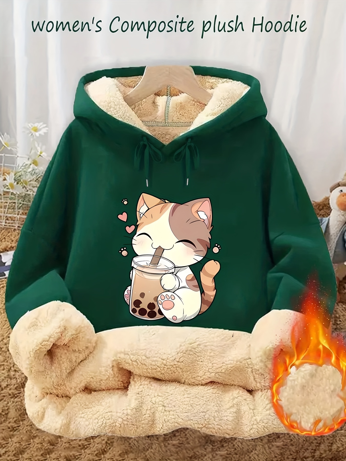 Women’s Plush Fleece Hooded Sweatshirt with & Boba Tea Print – Thick Winter Pullover Sweater, Green Kawaii Lettering, Machine Washable Cozy Sweater for Casual Wear, Loungewear & Anime Fans