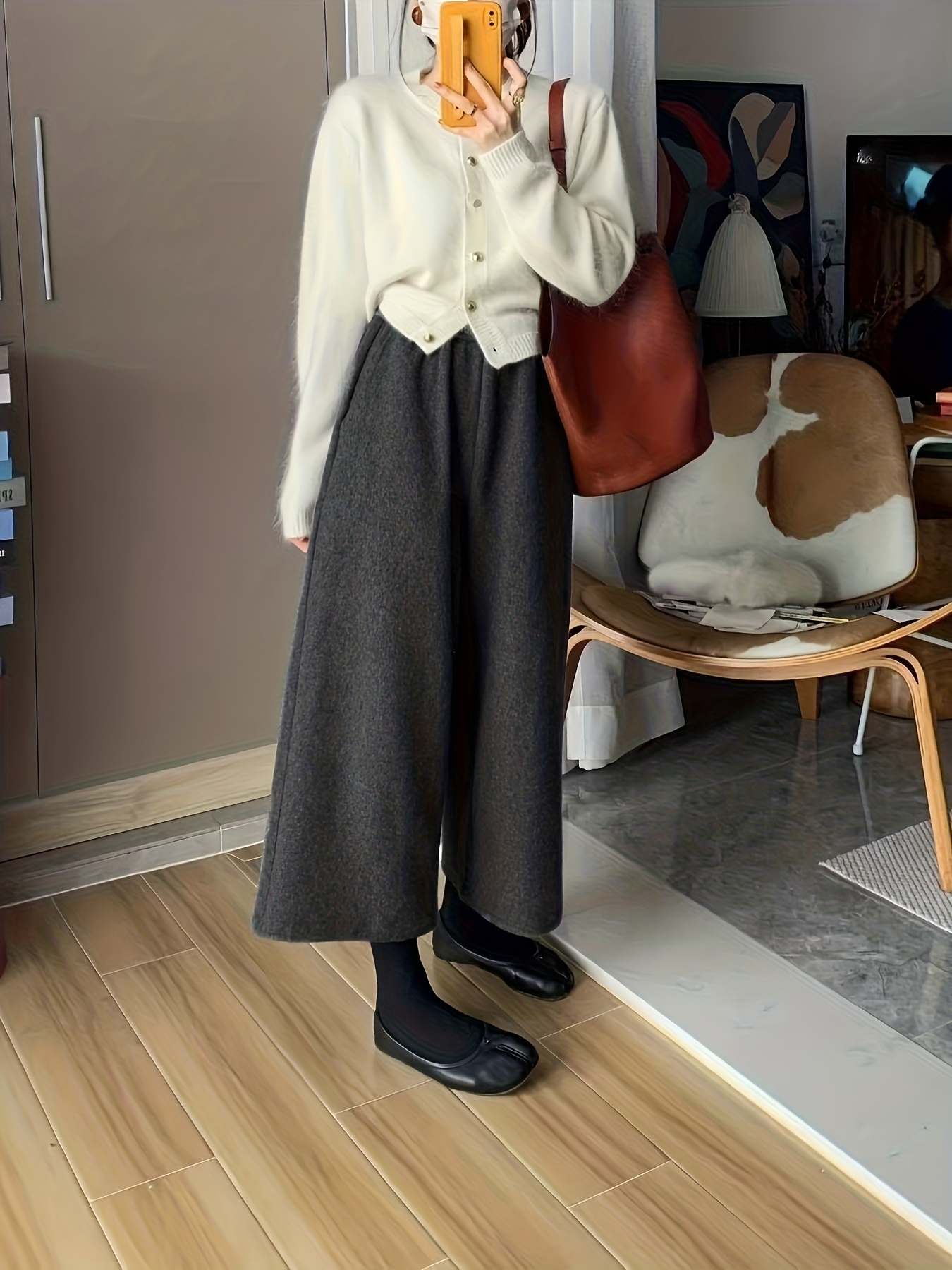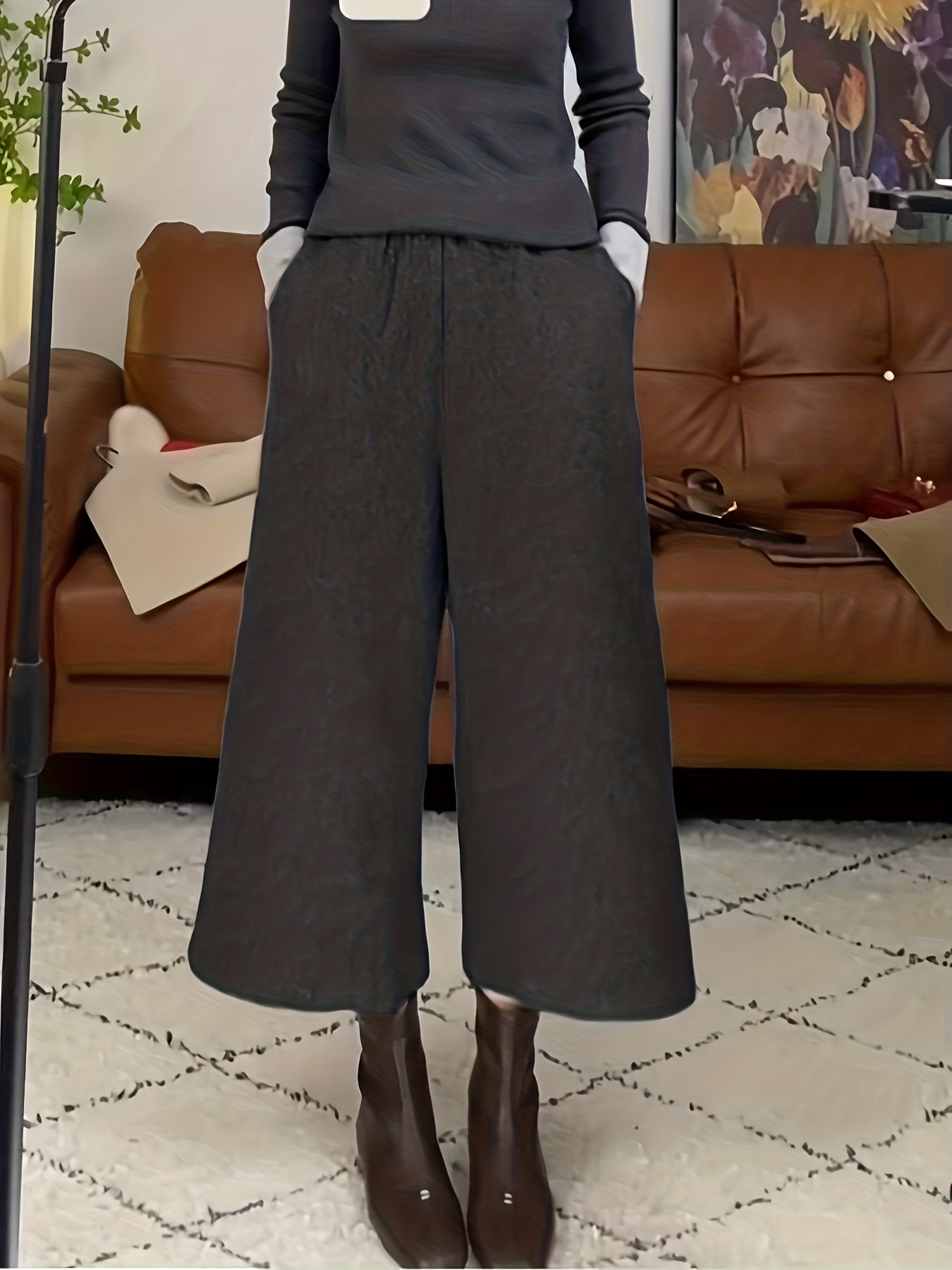Women’s Winter Wide-Leg Tweed Pants with Elastic Waist – Loose Fit ¾ Length Trousers, Solid Color Casual for Cold Weather, Pockets (No Required)