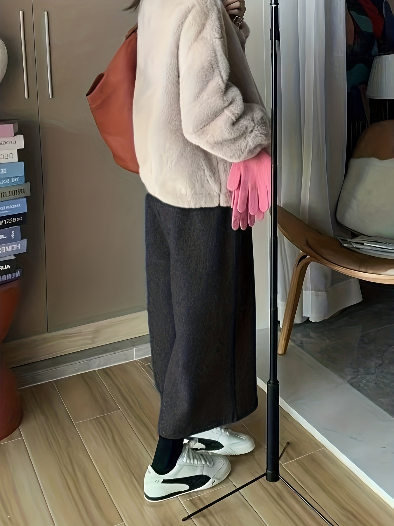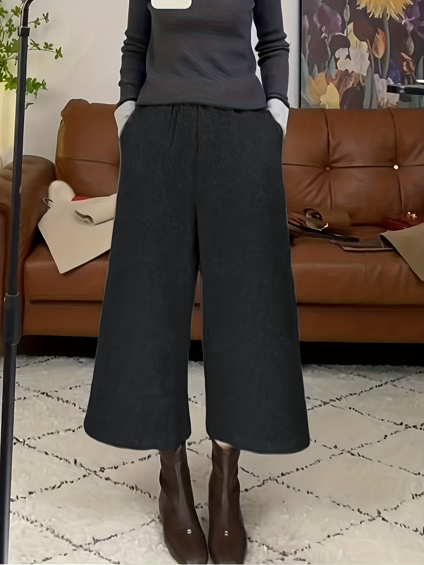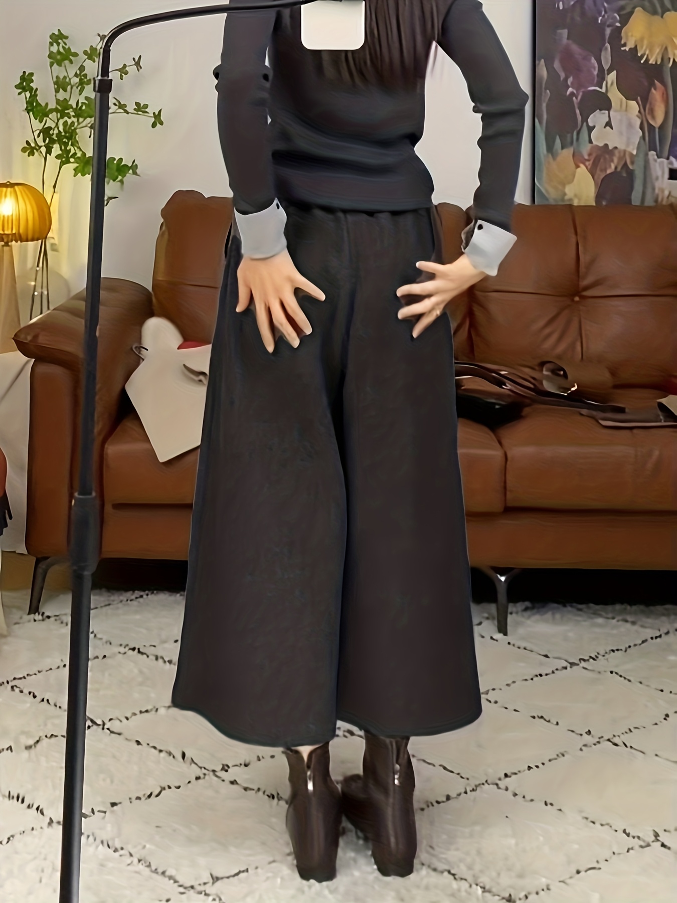 Women’s Winter Wide-Leg Tweed Pants with Elastic Waist – Loose Fit ¾ Length Trousers, Solid Color Casual for Cold Weather, Pockets (No Required)