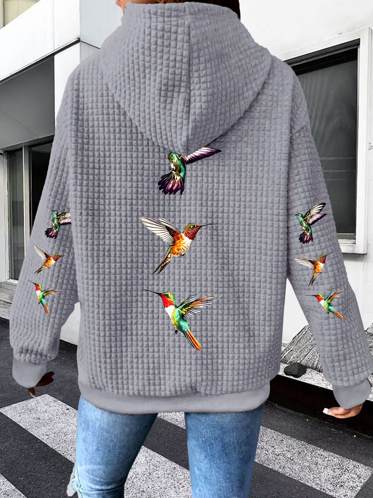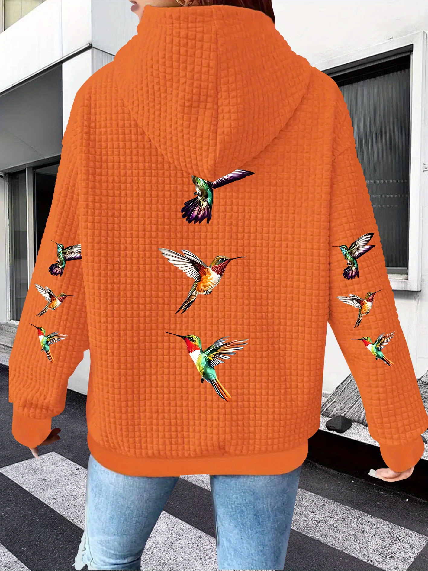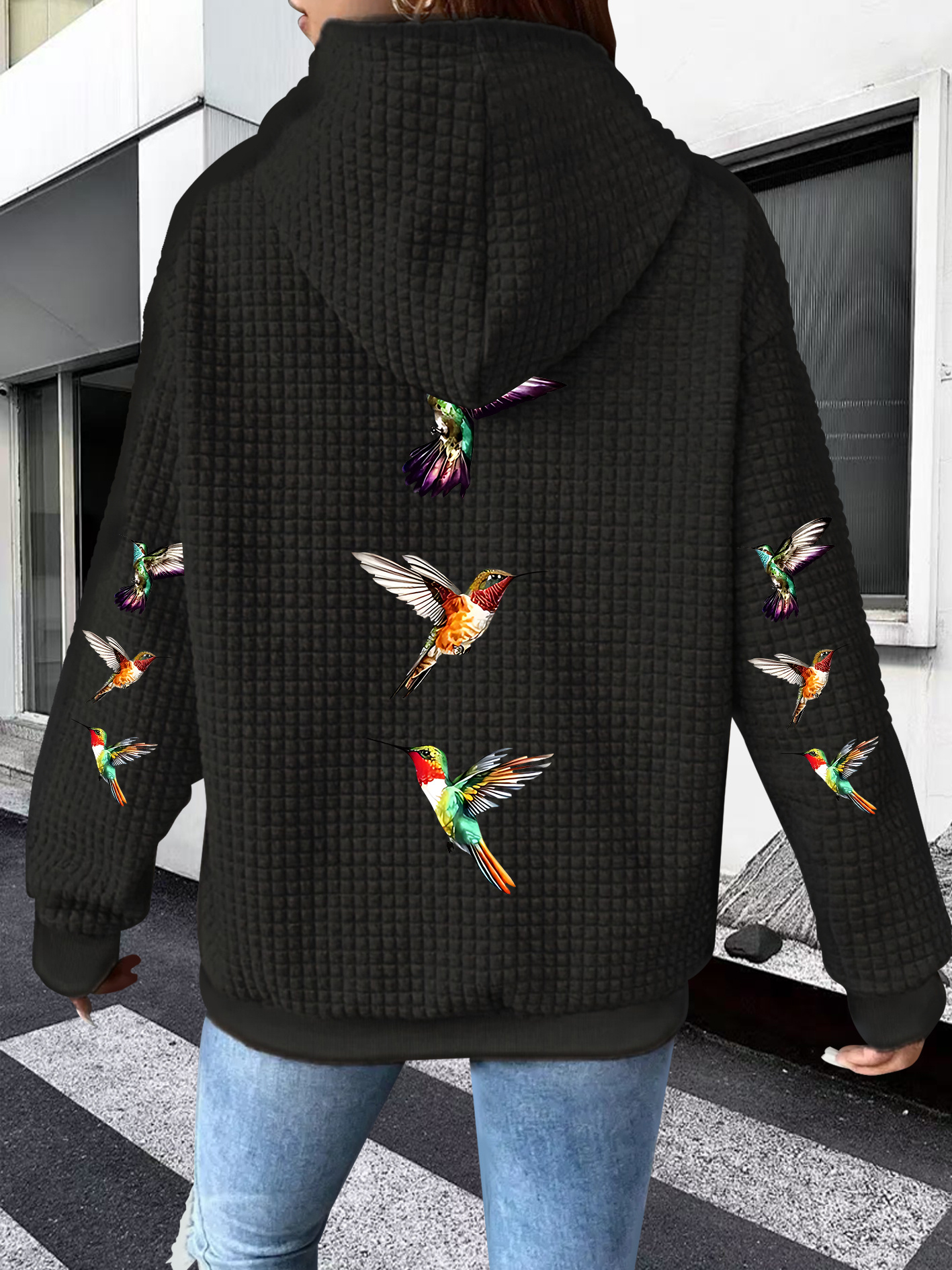 Women’s Waffle Zip-Up Hoodie – Pink & Black Geometric Bird Print, Front Zipper & Drawstring Hood, Soft Casual Hooded Sweatshirt